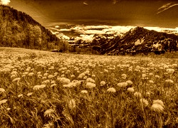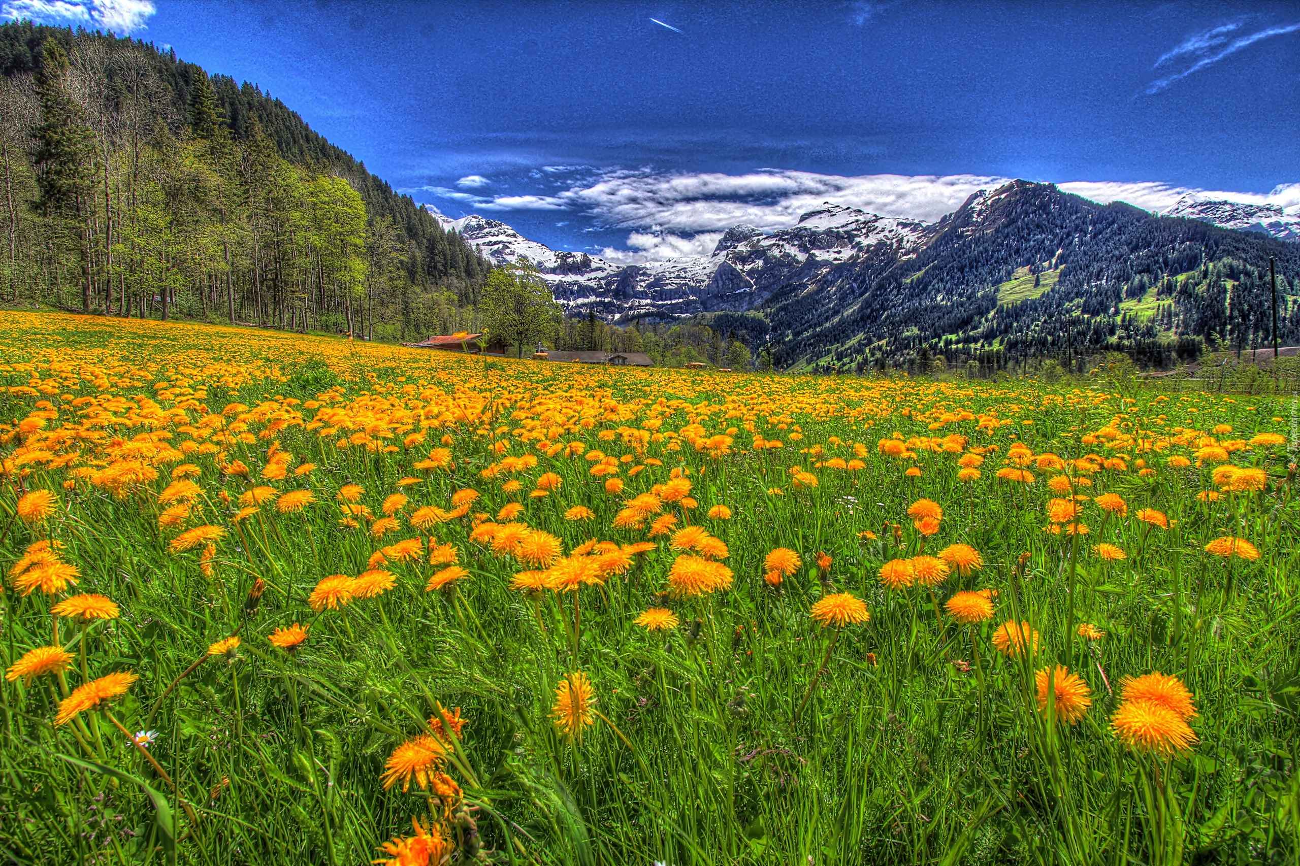 Edytor tapety: Łąka, Kwiaty, Góry, Lasy, Chmury, Wiosna