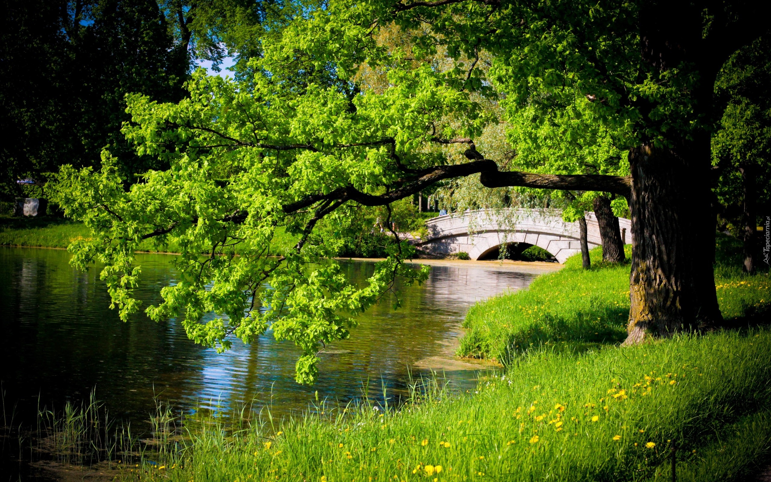 Edytor tapety: Rzeka, Mostek, Park, Kwiaty, Wiosna