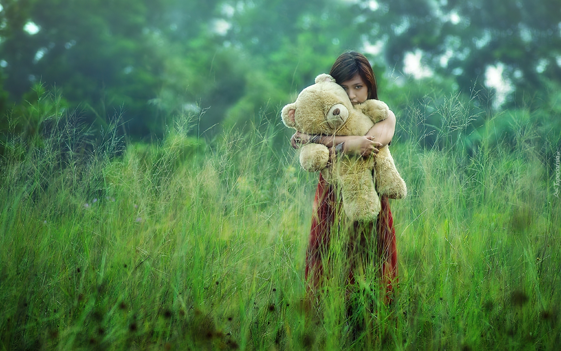Edytor tapety: Dziewczynka, Pluszowy, Miś, Łąka