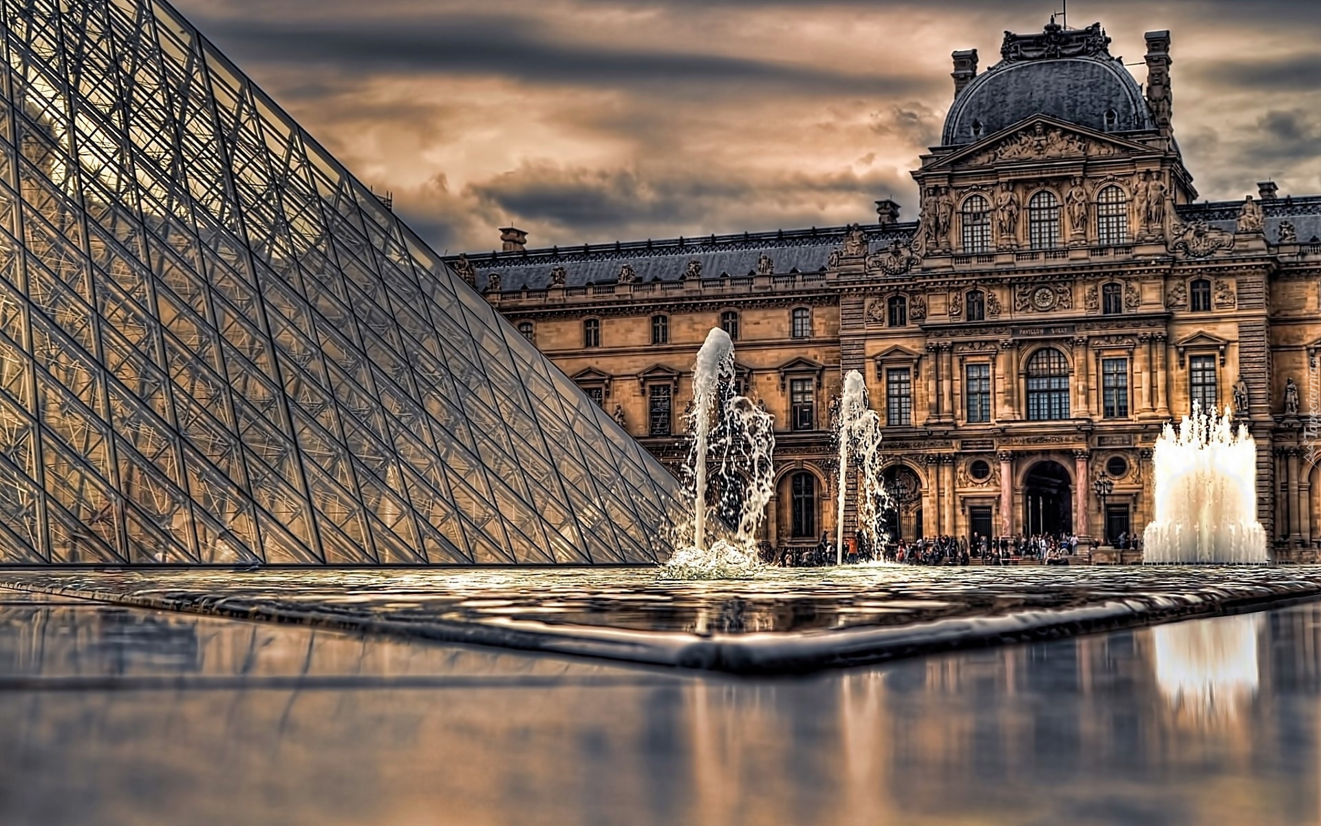 Edytor tapety: Paryż, Fragment, Luwru, Sadzawka, Fontanna, Ciemne, Chmury