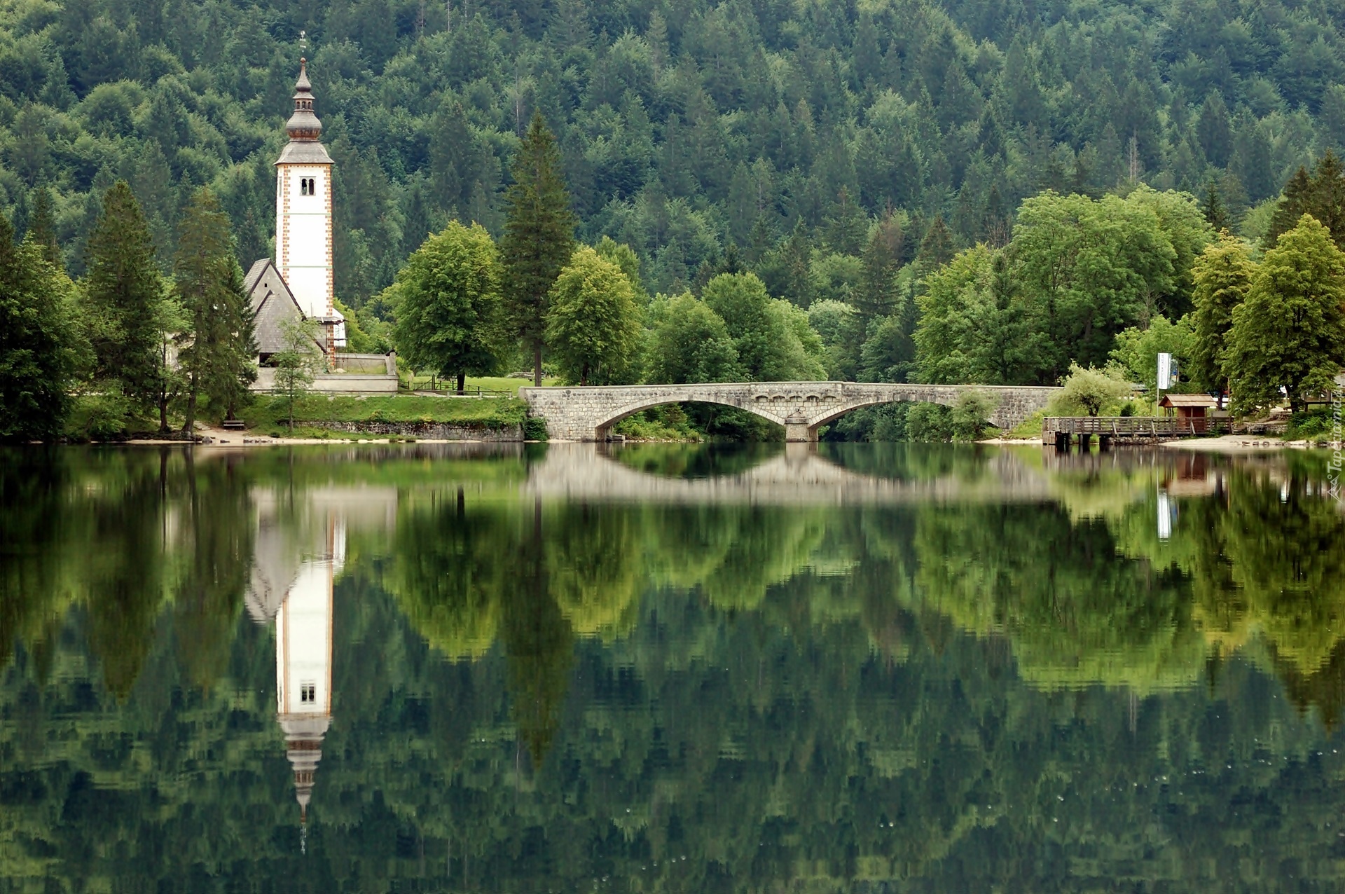 Edytor tapety: Las, Jezioro, Kościół, Most, Odbicie