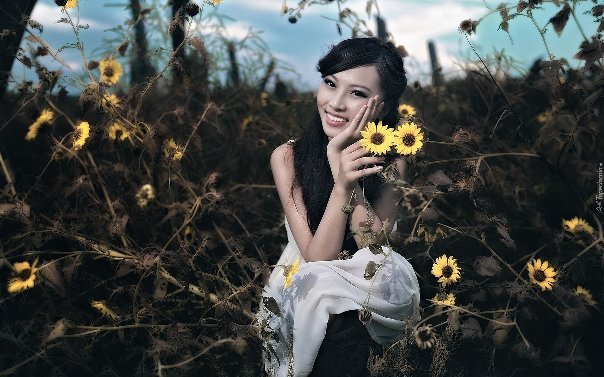 Edytor tapety: Brunetka, Uśmiech, Pole, Łąka, Kwiaty