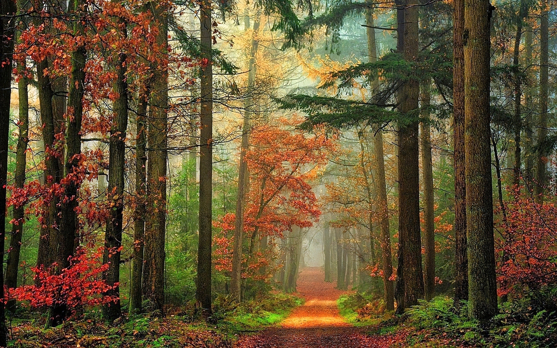 Edytor tapety: Las, Droga, Przebijające, Światło, Liście, Jesień