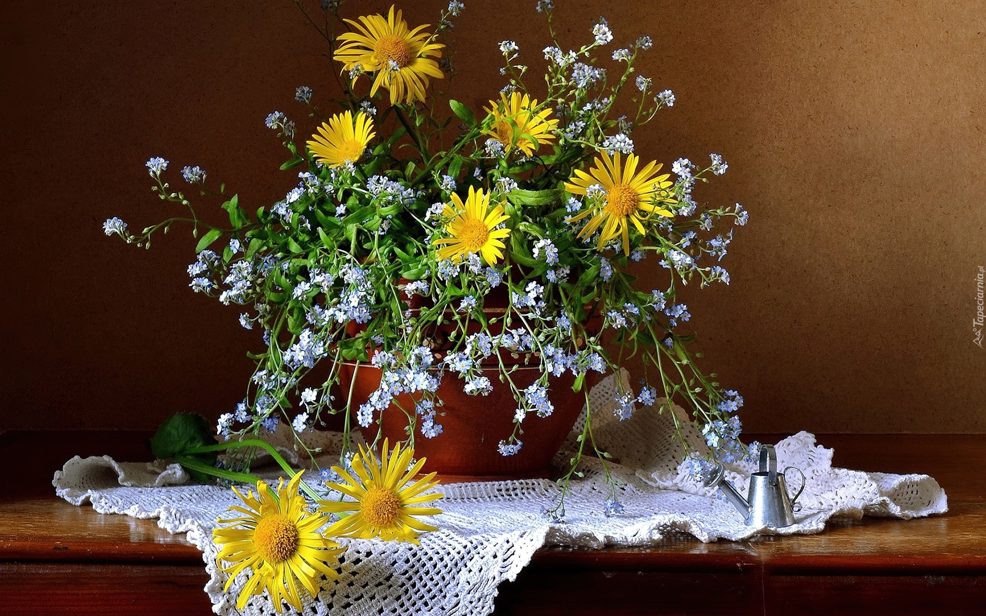 Edytor tapety: Kompozycja, Bukiet, Niezapominajki, Rudbekia, Serweta