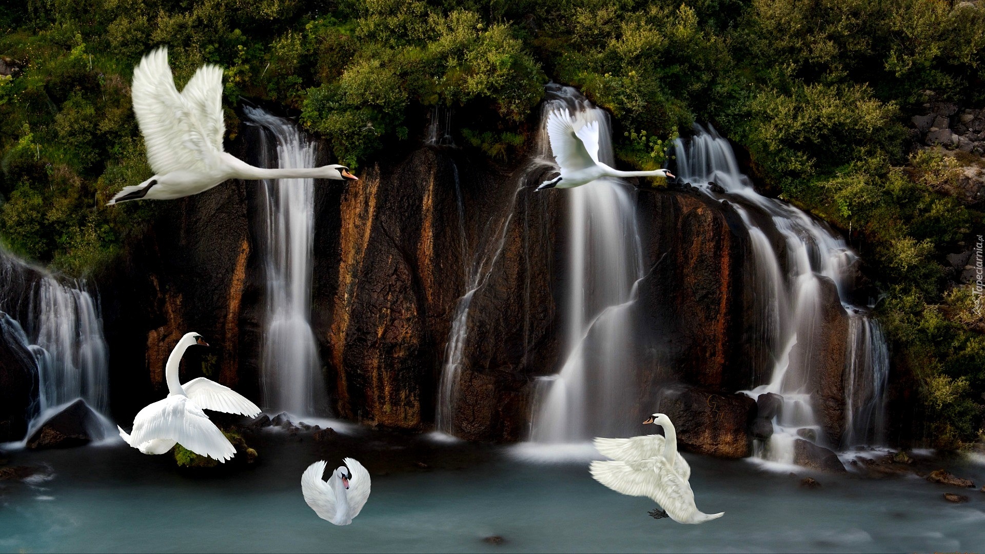 Edytor tapety: Wodospad, Skały, Łabędzie