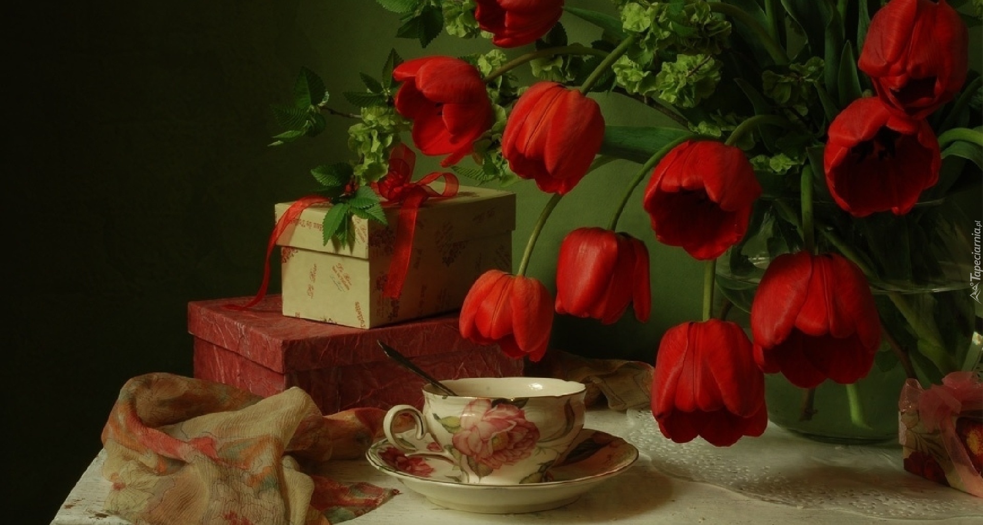 Edytor tapety: Czerwone, Tulipany, Filiżanka, Prezent