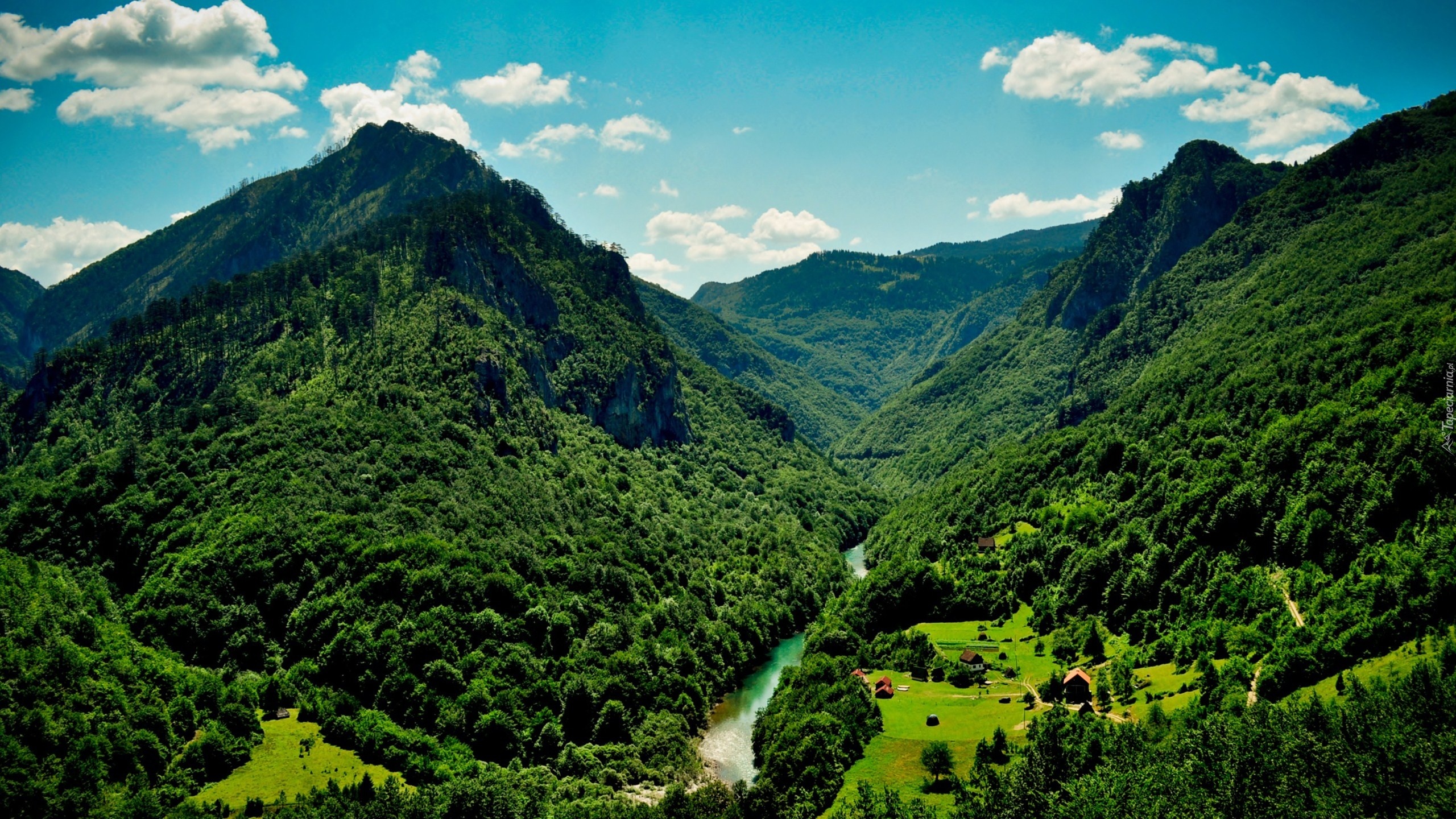 Edytor tapety: Góry, Las, Rzeka, Domy