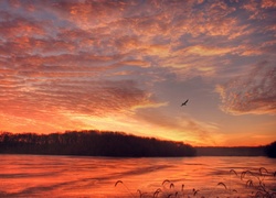 Edytor tapety: Rzeka, Chmury, Ptak, Zachód Słońca