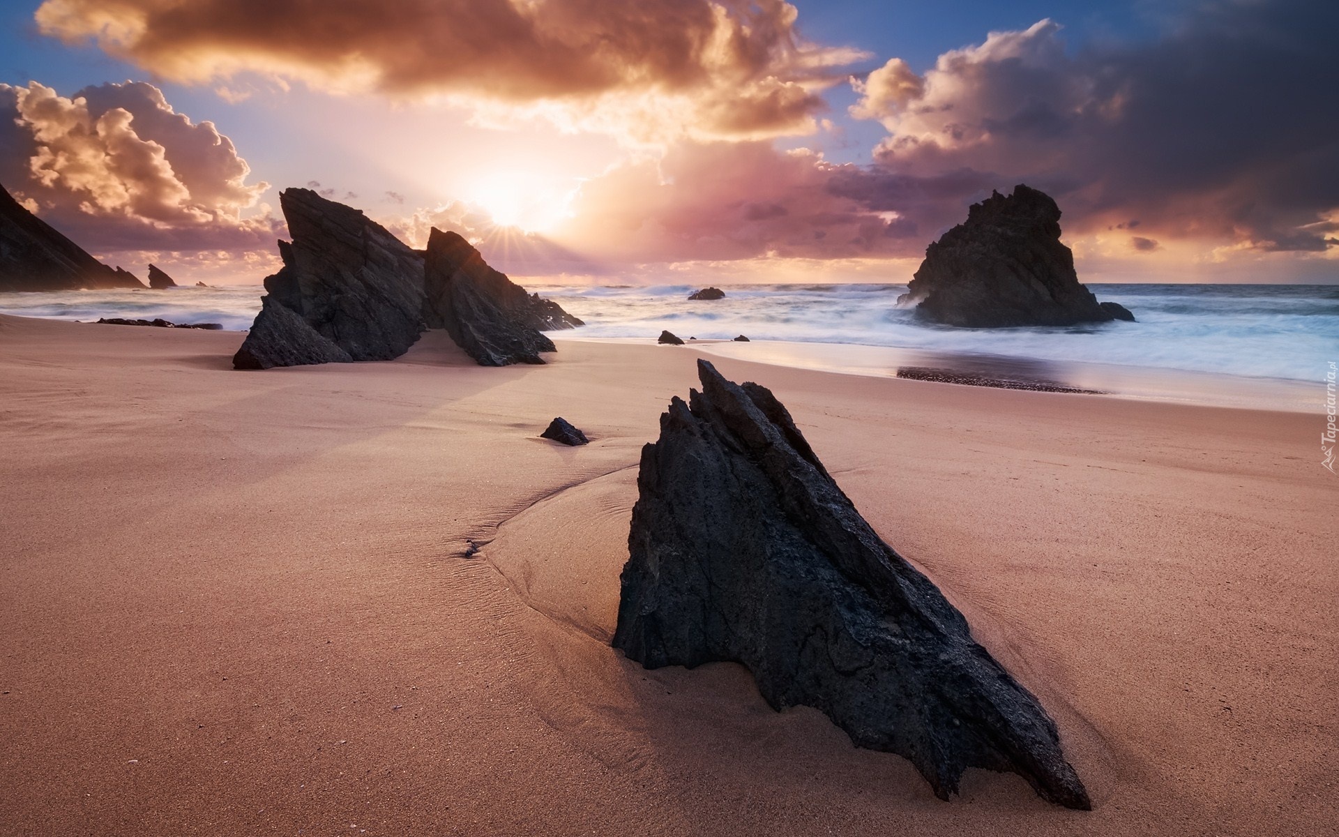 Edytor tapety: Plaża, Skały, Morze, Chmury, Zachód Słońca
