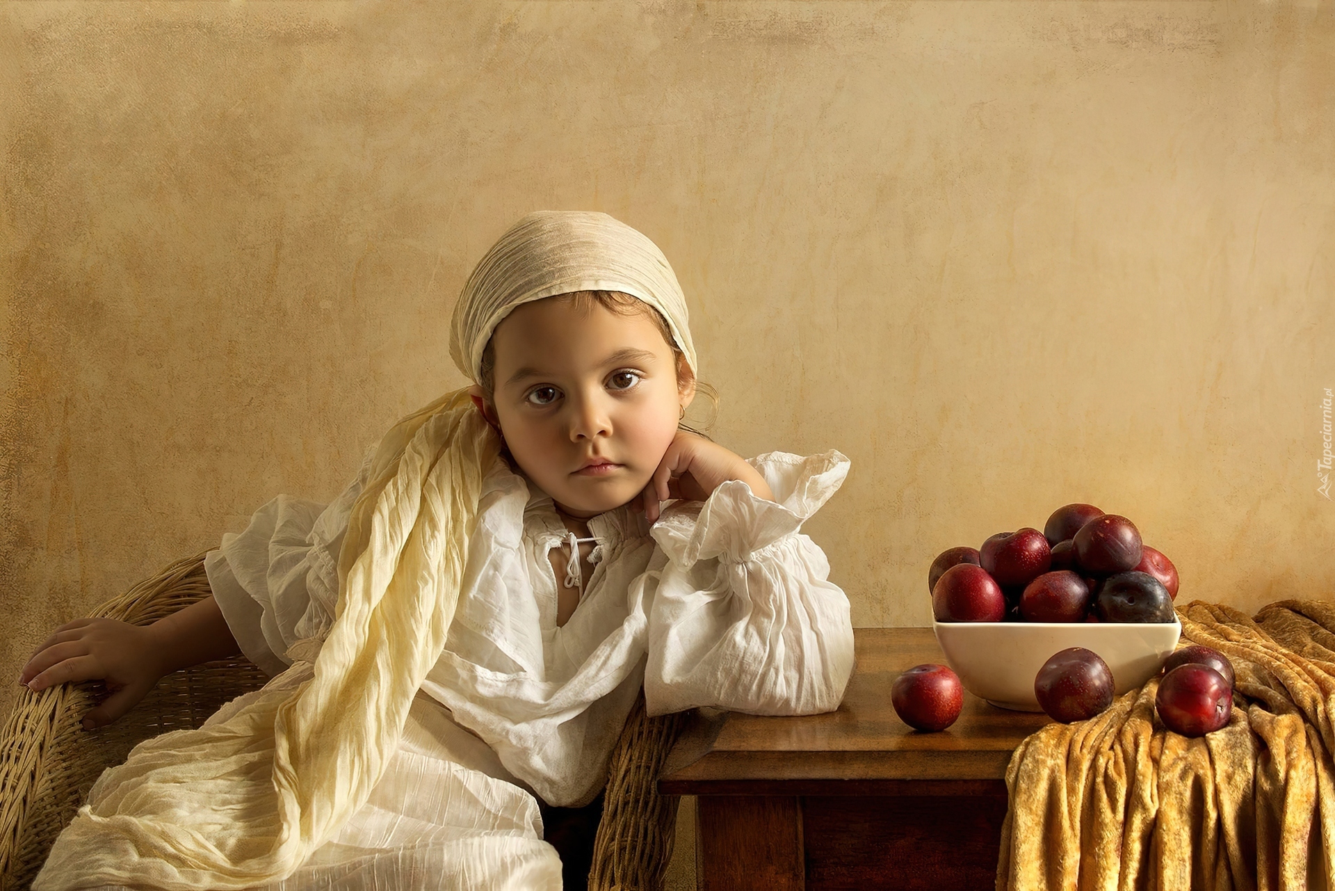Edytor tapety: Dziewczynka, Śliwki, Stół