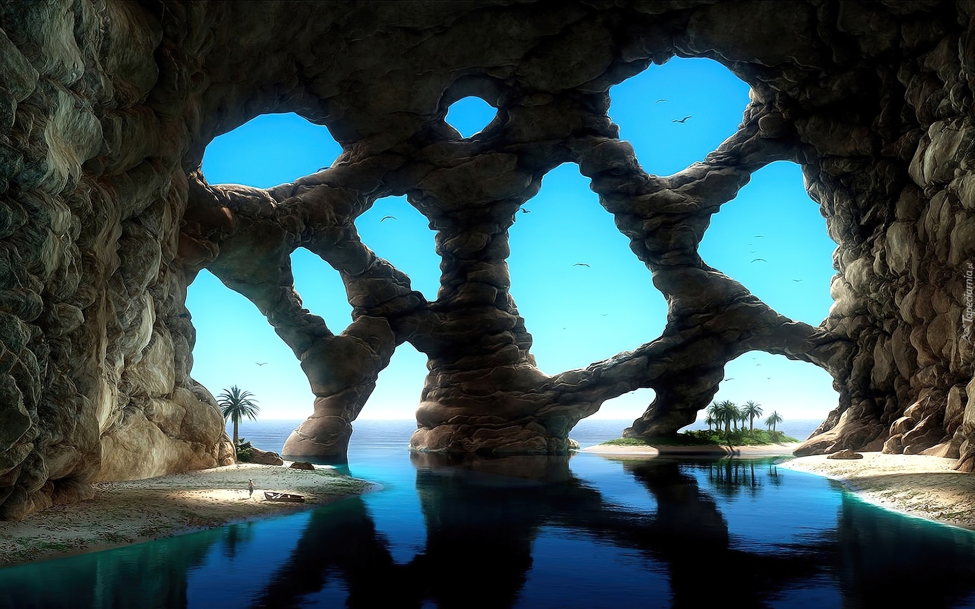 Edytor tapety: Fantasy, Jaskinia, Skały, Morze, Palmy, Ptaki