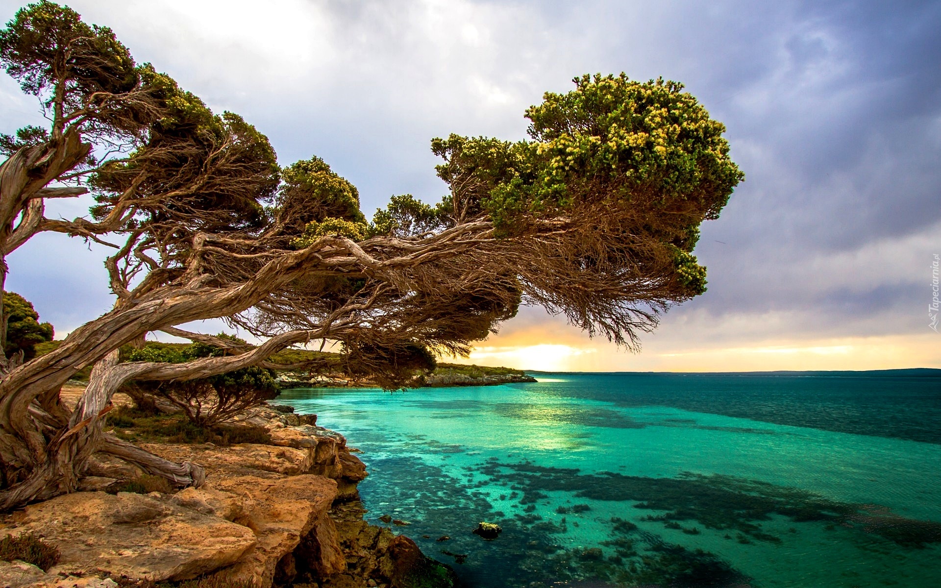 Edytor tapety: Morze, Skały, Pochylone, Drzewo