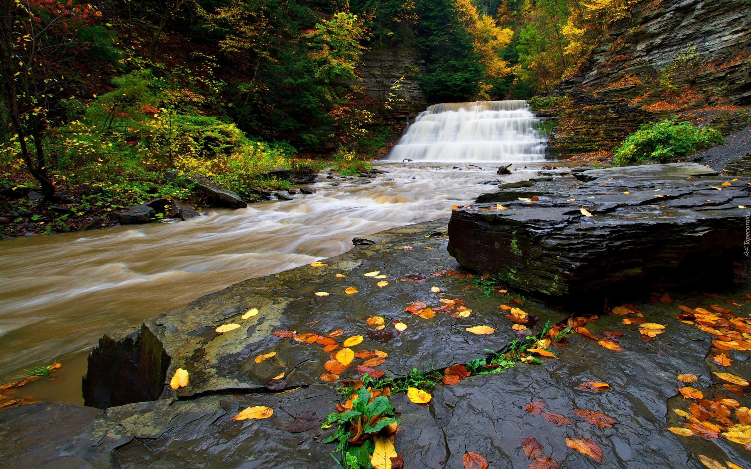 Edytor tapety: Wodospad, Skały, Liście, Las, Jesień