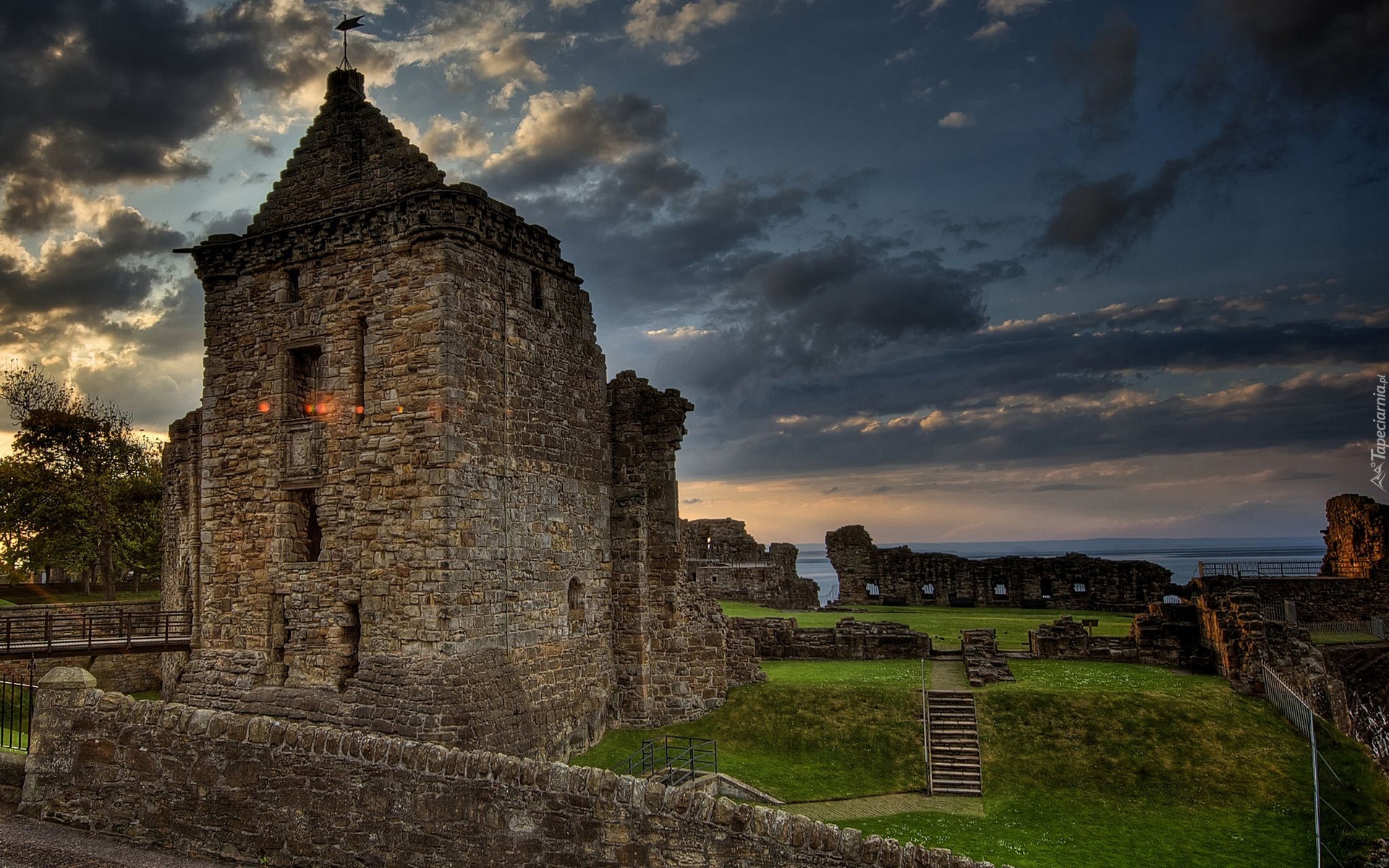 Edytor tapety: Ruiny, Forteca, Zamek St Andrews, St Andrews Castle, Szkocja, Ciemne, Chmury, Drzewa