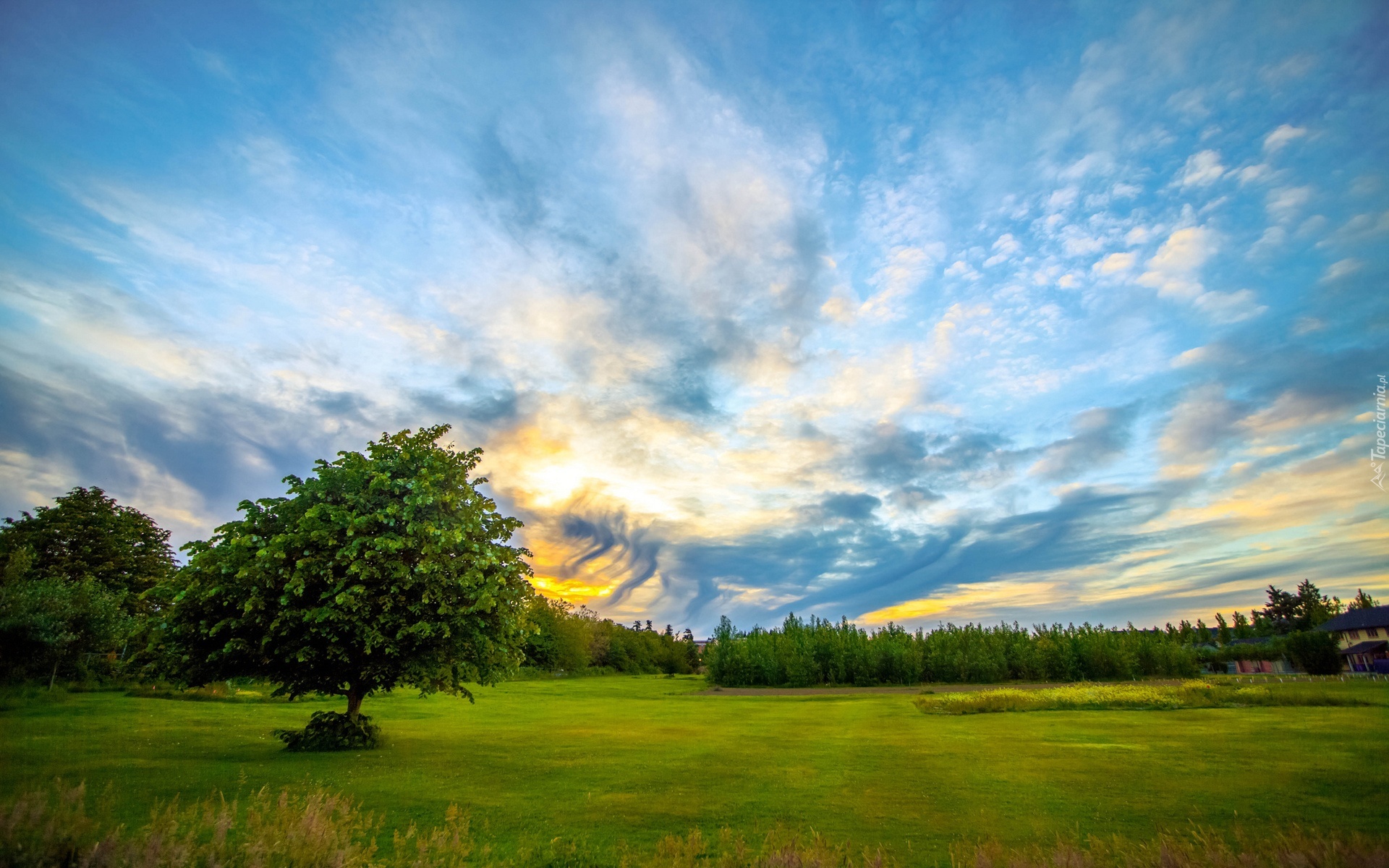 Edytor tapety: Łąka, Drzewa, Domy, Chmury, Wschód, Słońca