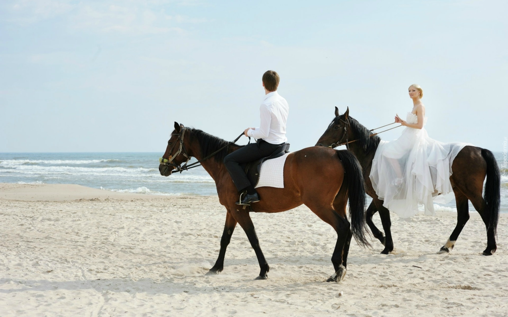 Edytor tapety: Młoda, Para, Konie, Plaża, Morze