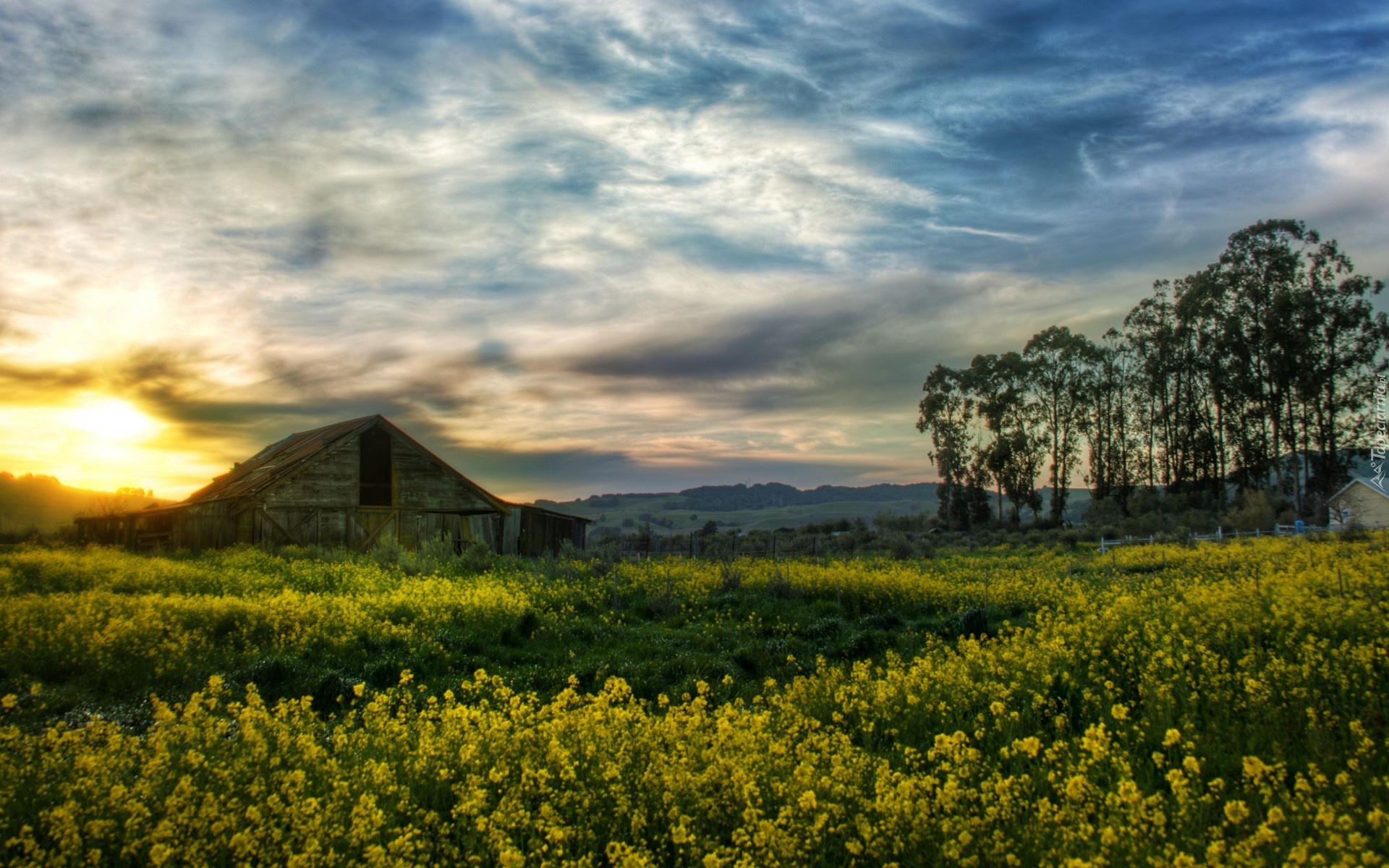 Edytor tapety: Stodoła, Łąka, Chmury, Zachód Słońca