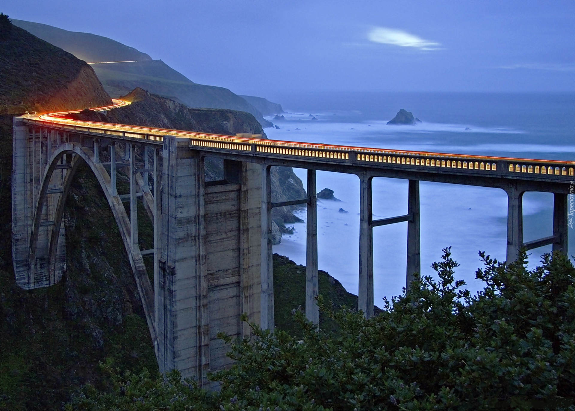 Edytor tapety: Góry, Morze, Most, Oświetlona, Droga, Drzewa, Rozmycie