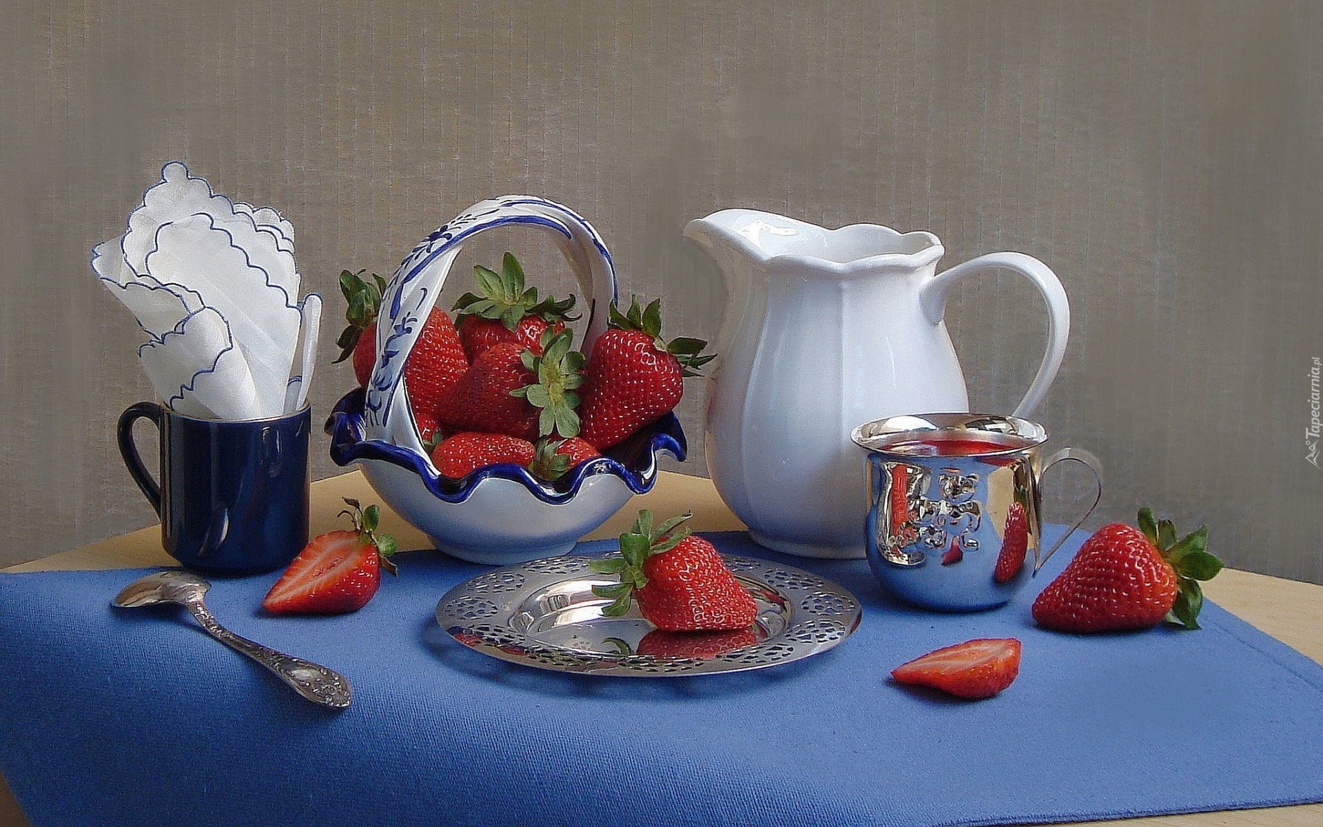Edytor tapety: Truskawki, Sok, Koszyk, Dzbanek, Kompozycja