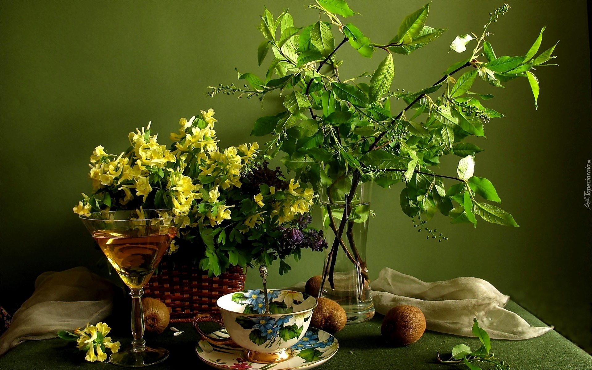 Edytor tapety: Żółte, Kwiatki, Zielona, Gałązka, Kieliszek, Kompozycja