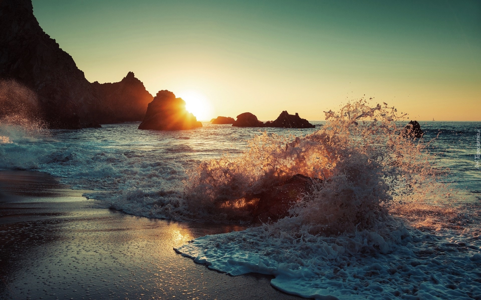 Edytor tapety: Morze, Fale, Skały, Wschód Słońca