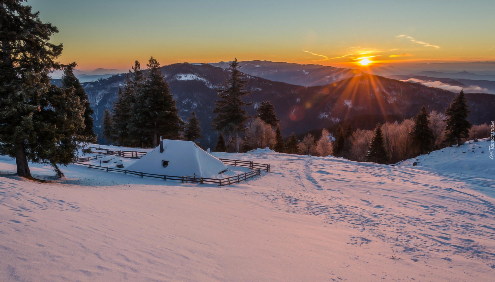 Edytor tapety: Zachód, Słońca, Góry, Śnieg, Domek, Świerki