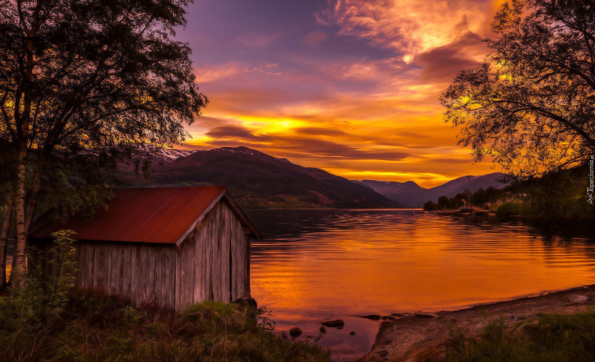 Edytor tapety: Jezioro, Zachód, Słońca, Góry, Drzewa, Szopa