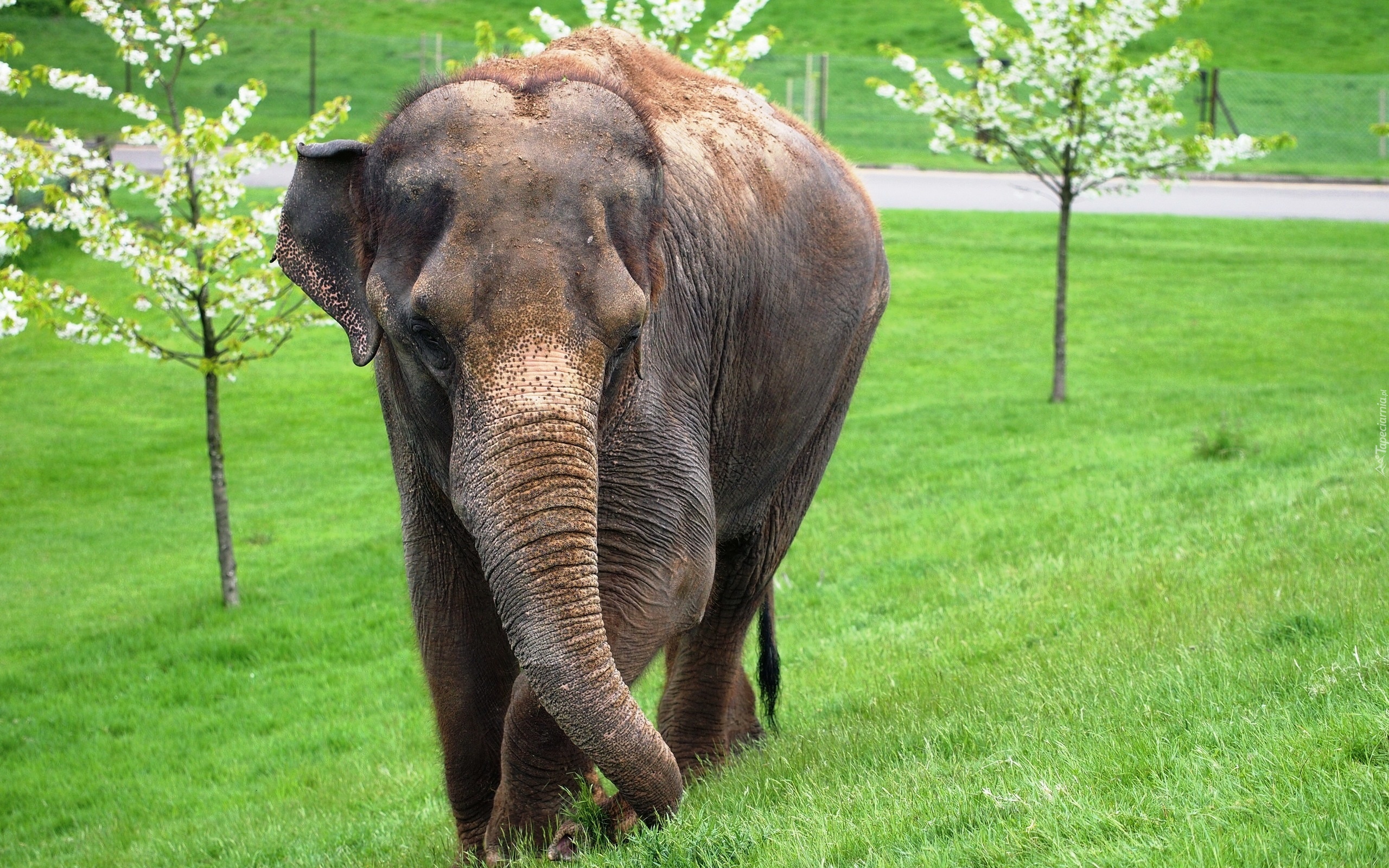 Edytor tapety: Słoń, Trawa, Kwitnące, Drzewa
