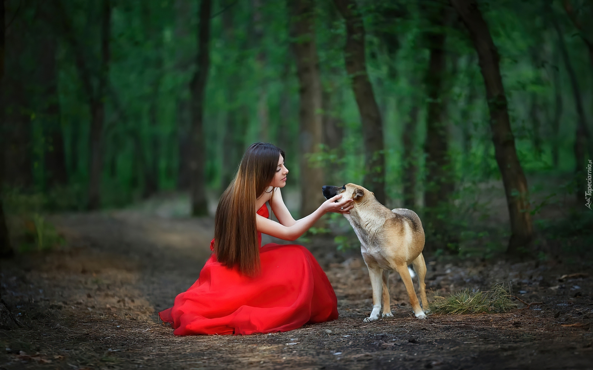 Edytor tapety: Dziewczyna, Czerwona, Sukienka, Las, Pies