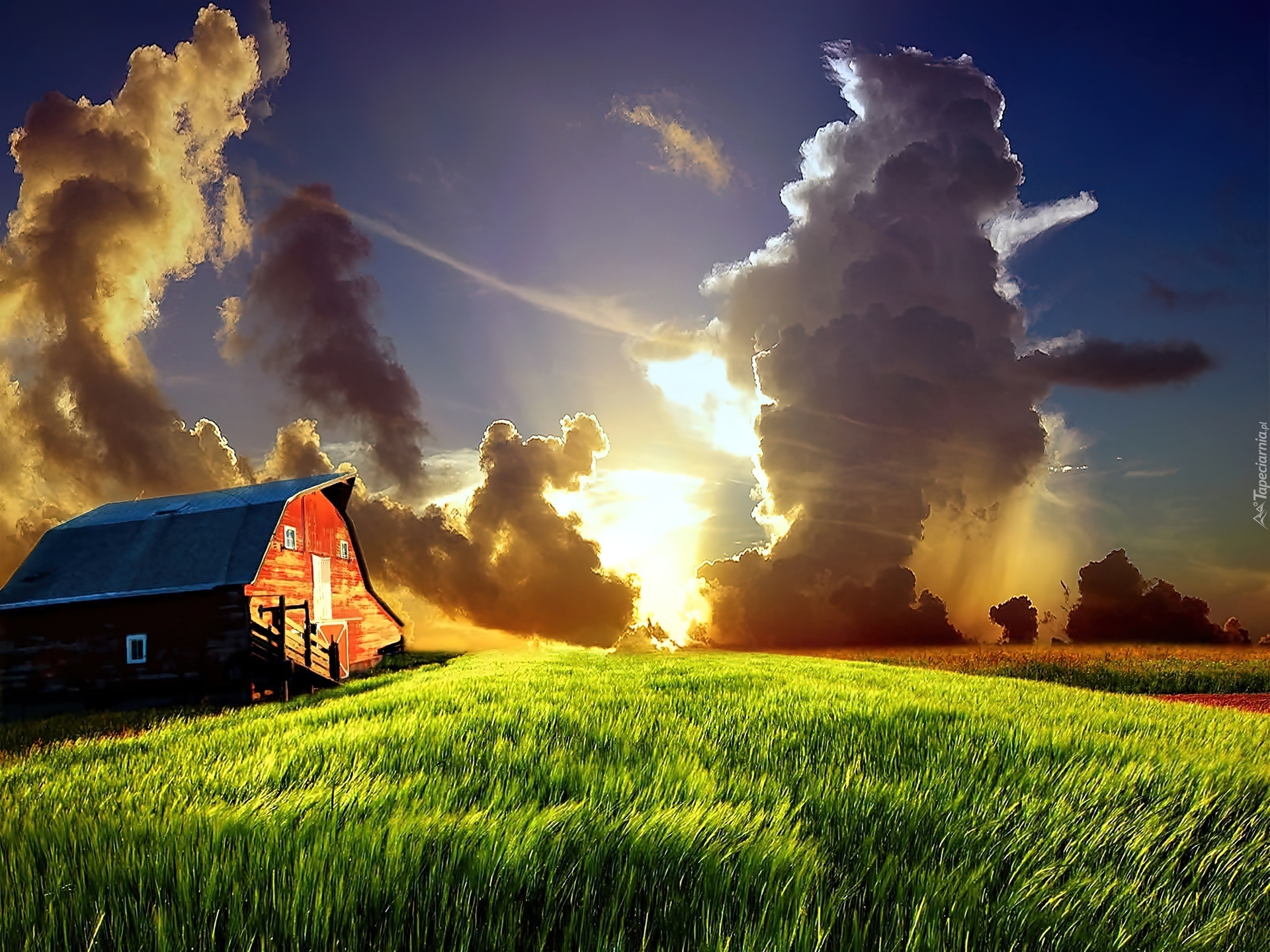 Edytor tapety: Dom, Pole, Chmury, Przebijające, Światło