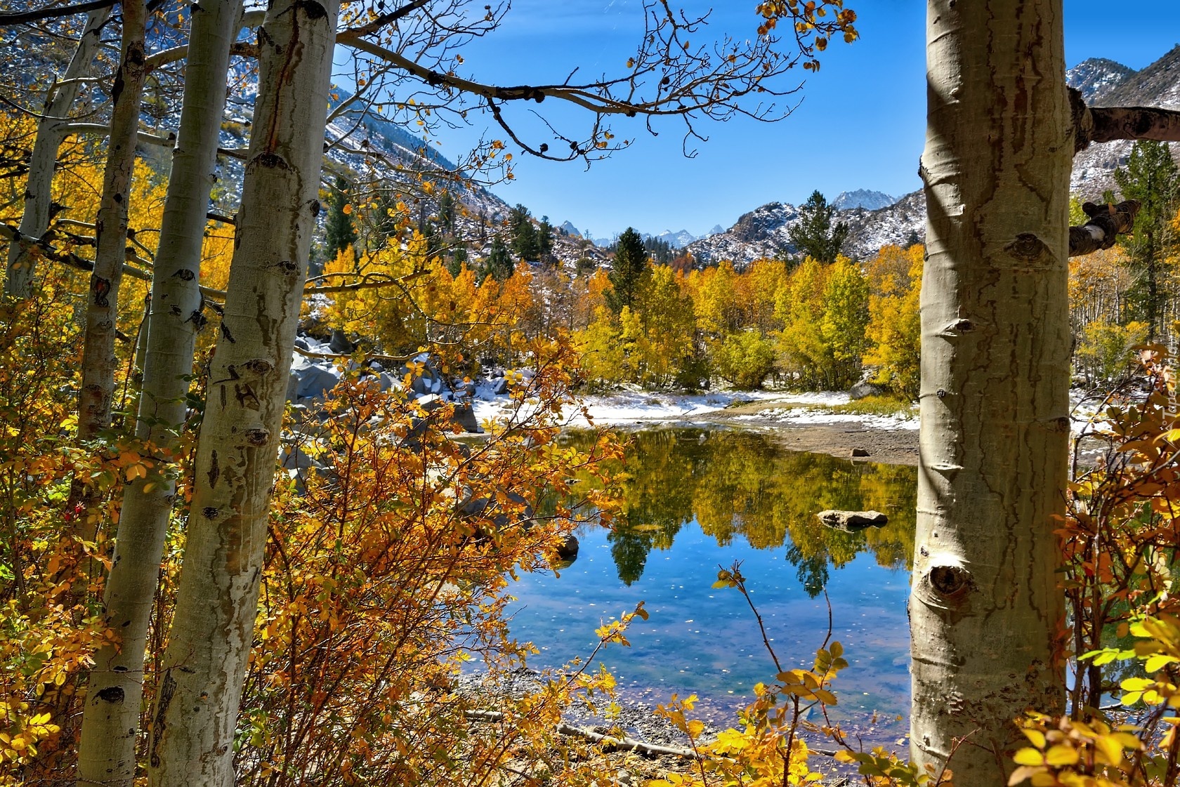Edytor tapety: Stany Zjednoczone, Stan Kalifornia, Park Narodowy Yosemite, Jezioro, Góry, Drzewa Jezioro