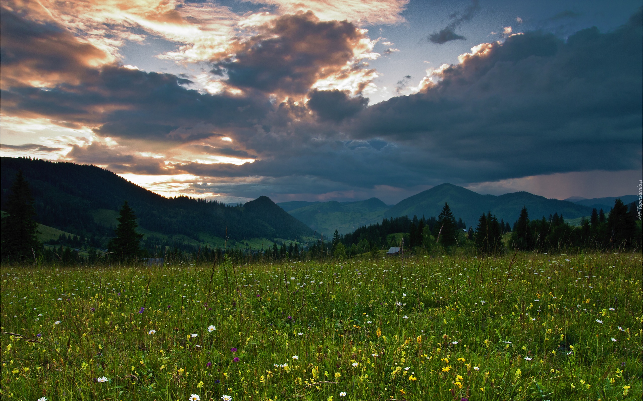 Edytor tapety: Łąka, Kwiaty, Góry, Lasy, Chmury