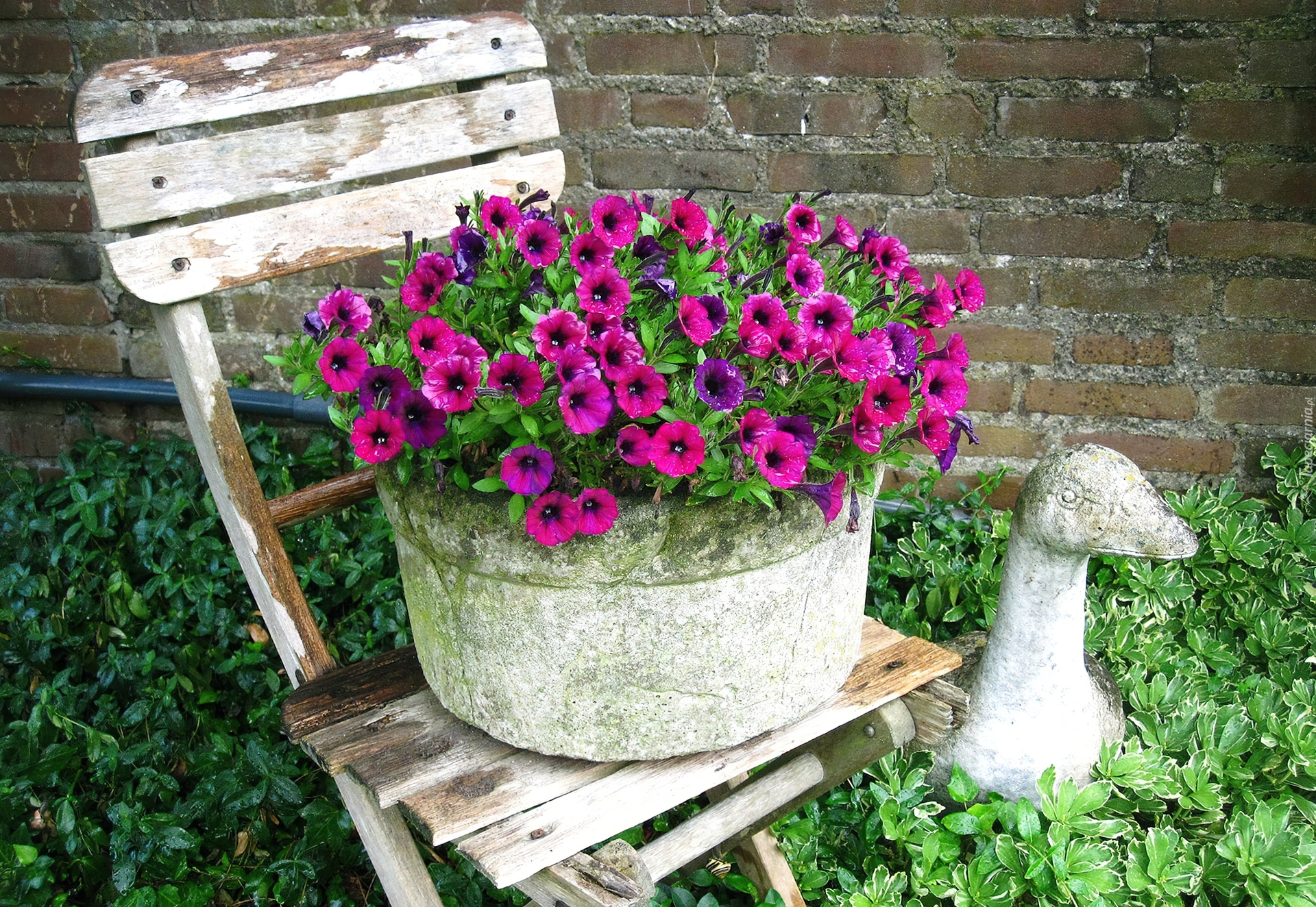 Edytor tapety: Ogródek, Krzesło, Kamienna Donica, Gąska, Petunie, Mur