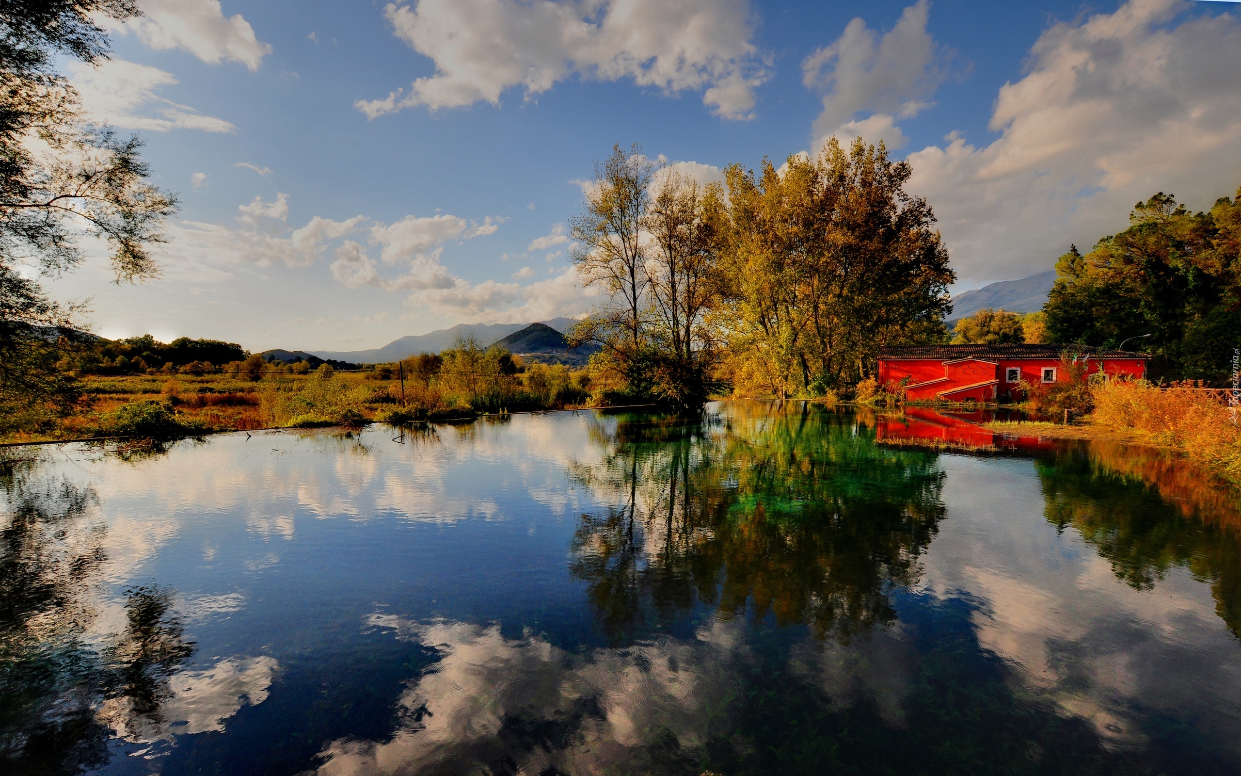 Edytor tapety: Rzeka, Dom, Lasy, Góry, Jesień