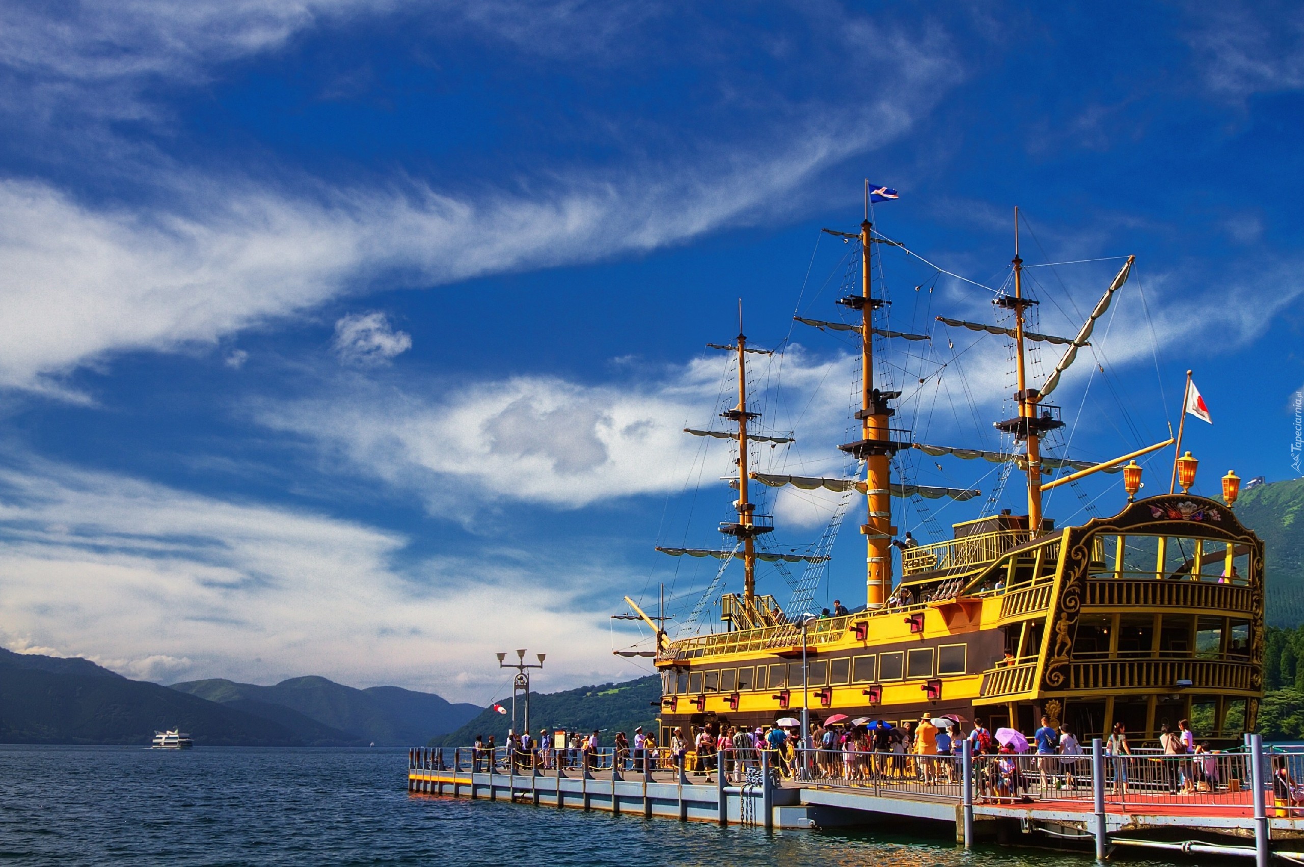 Edytor tapety: Statek, Wycieczkowy, Molo, Turyści, Jezioro, Góry