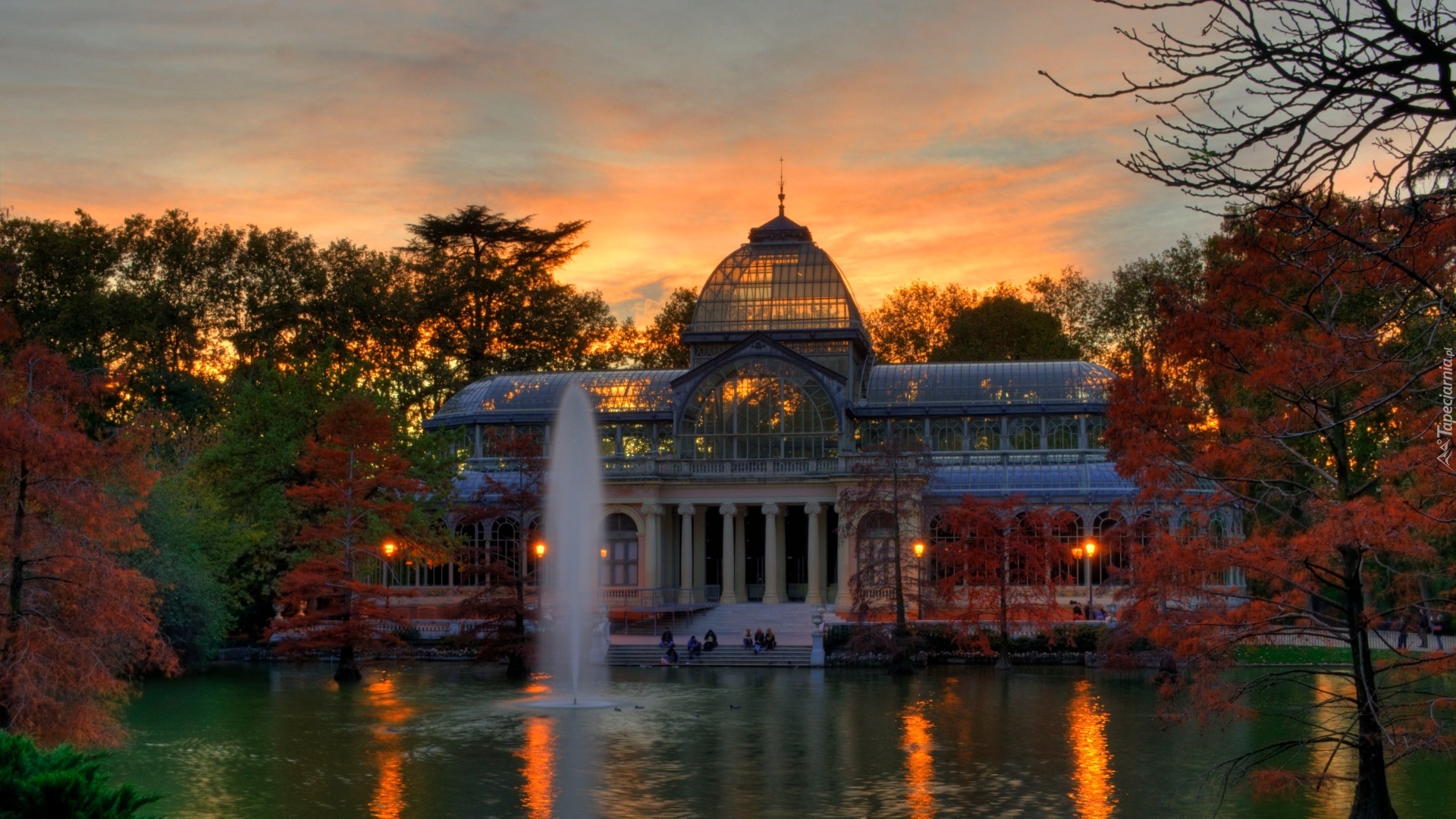 Edytor tapety: Pałac, Kryształowy, Fontanna, Park, Zachód, Słońca, Madryt, Hiszpania