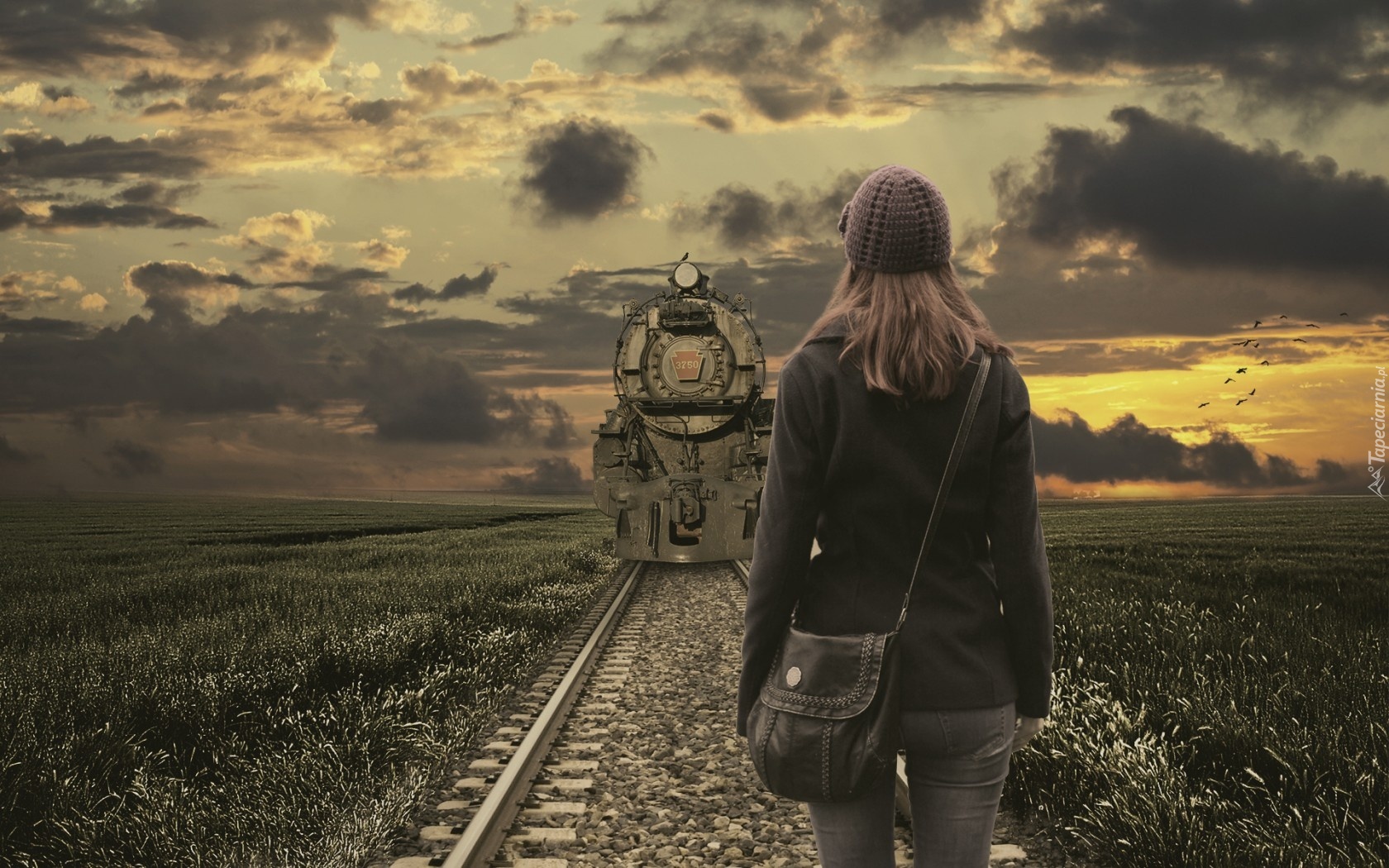 Edytor tapety: Dziewczna, Pociąg, Łąki, Zachód, Słońca, Chmury