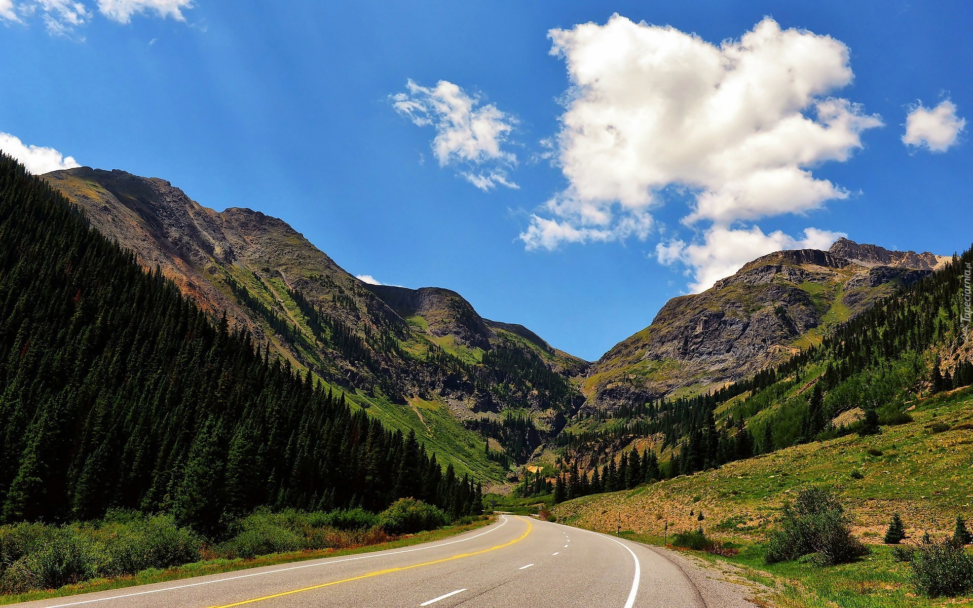 Edytor tapety: Góry, Lasy, Droga, Obłoki, Przebijające, Światło