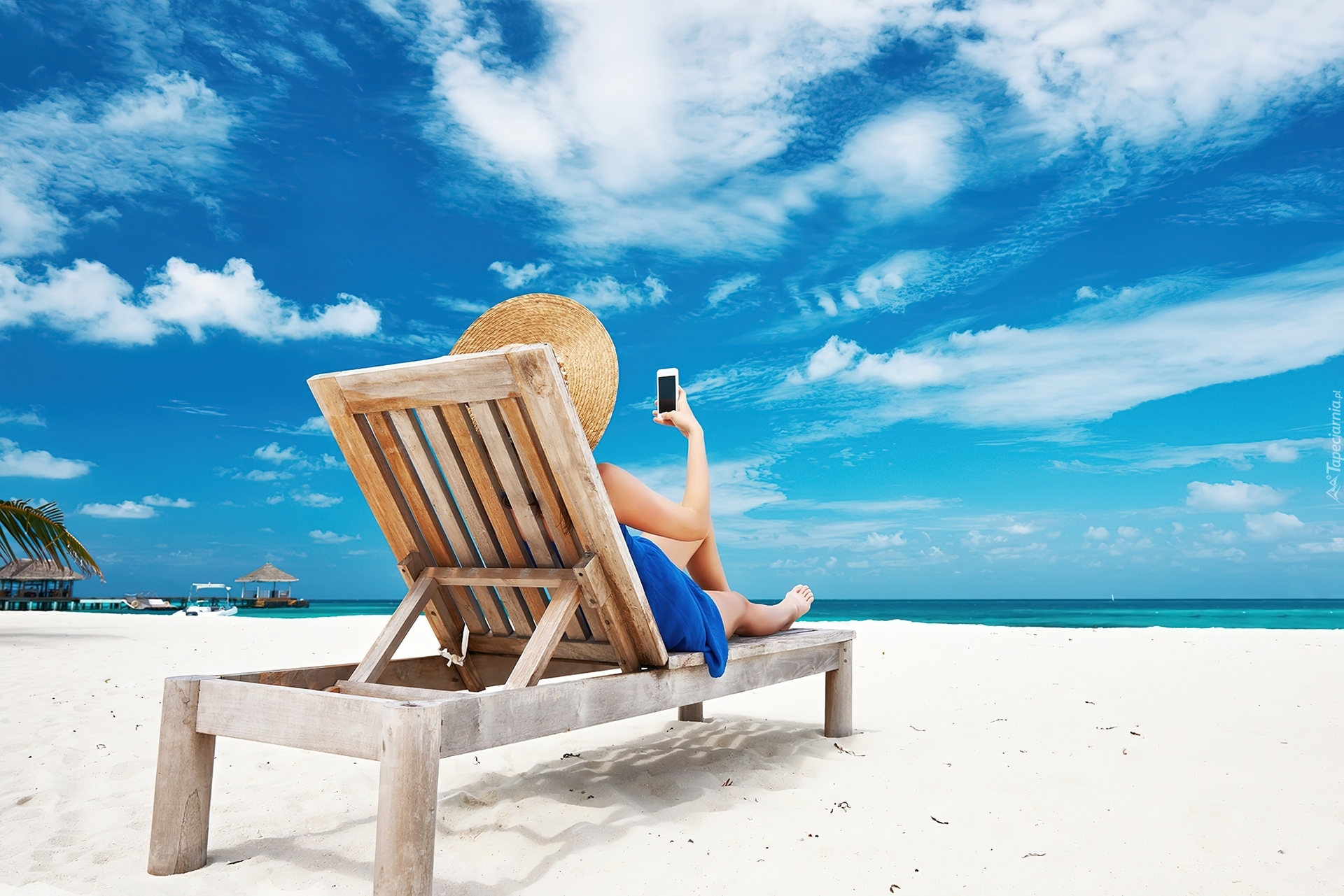 Edytor tapety: Kobieta, Plaża, Leżak, Telefon, Wakacje