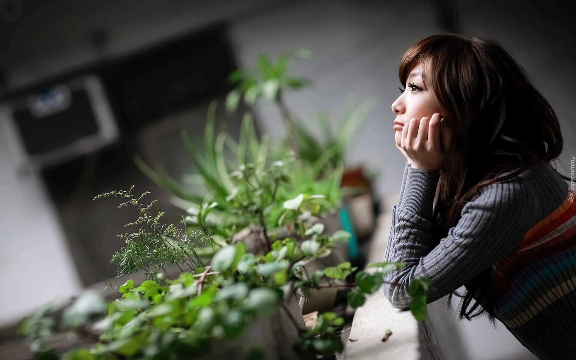 Edytor tapety: Zamyślona, Brunetka, Balkon, Rośliny