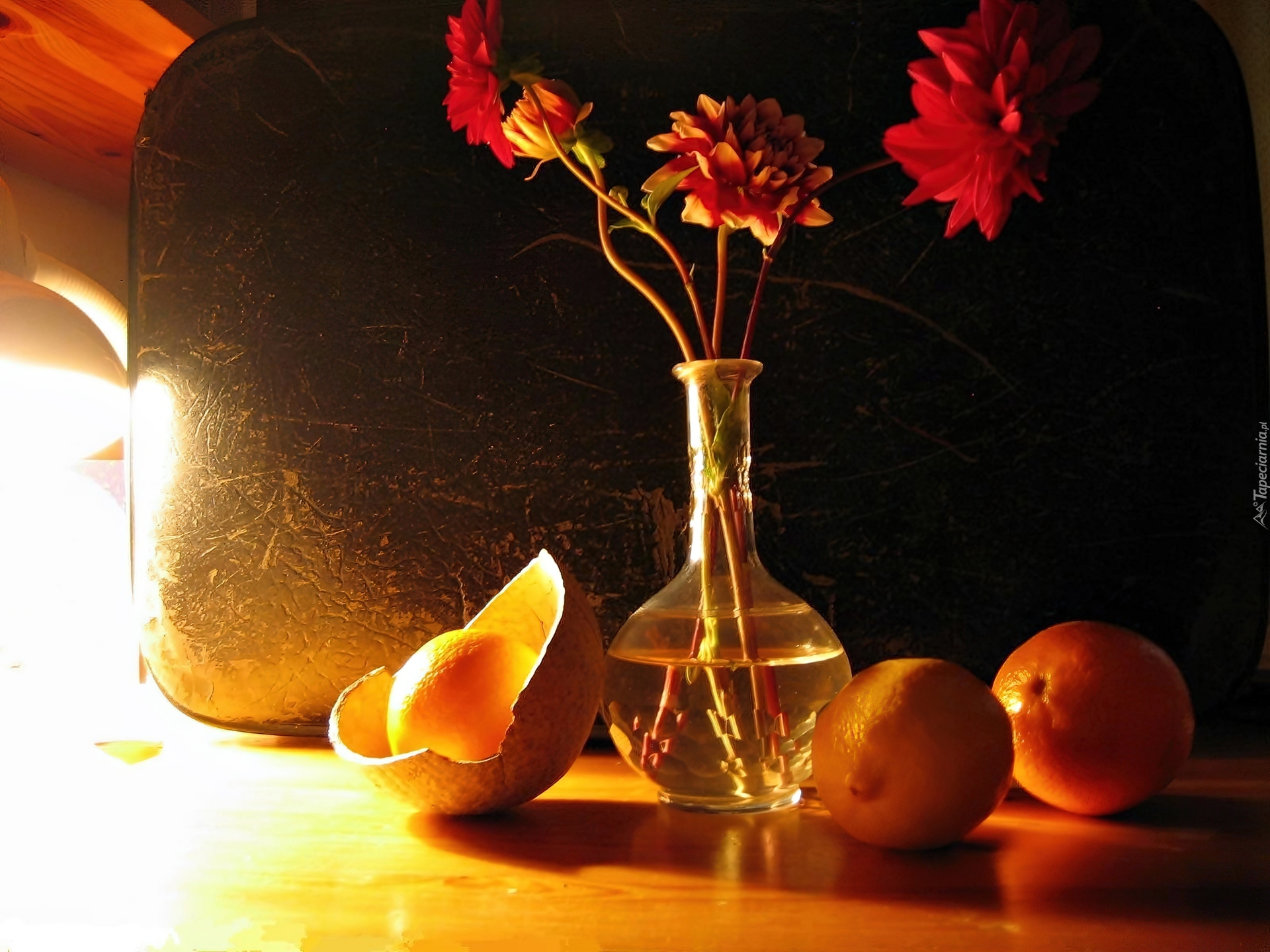 Edytor tapety: Pomarańcze, Wazon, Dalie, Przebijające, Światło