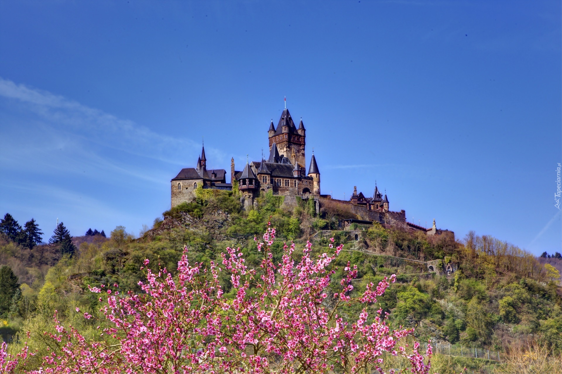 Edytor tapety: Zamek, Reichsburg, Wzgórze, Wiosna, Kwitnące, Drzewo
