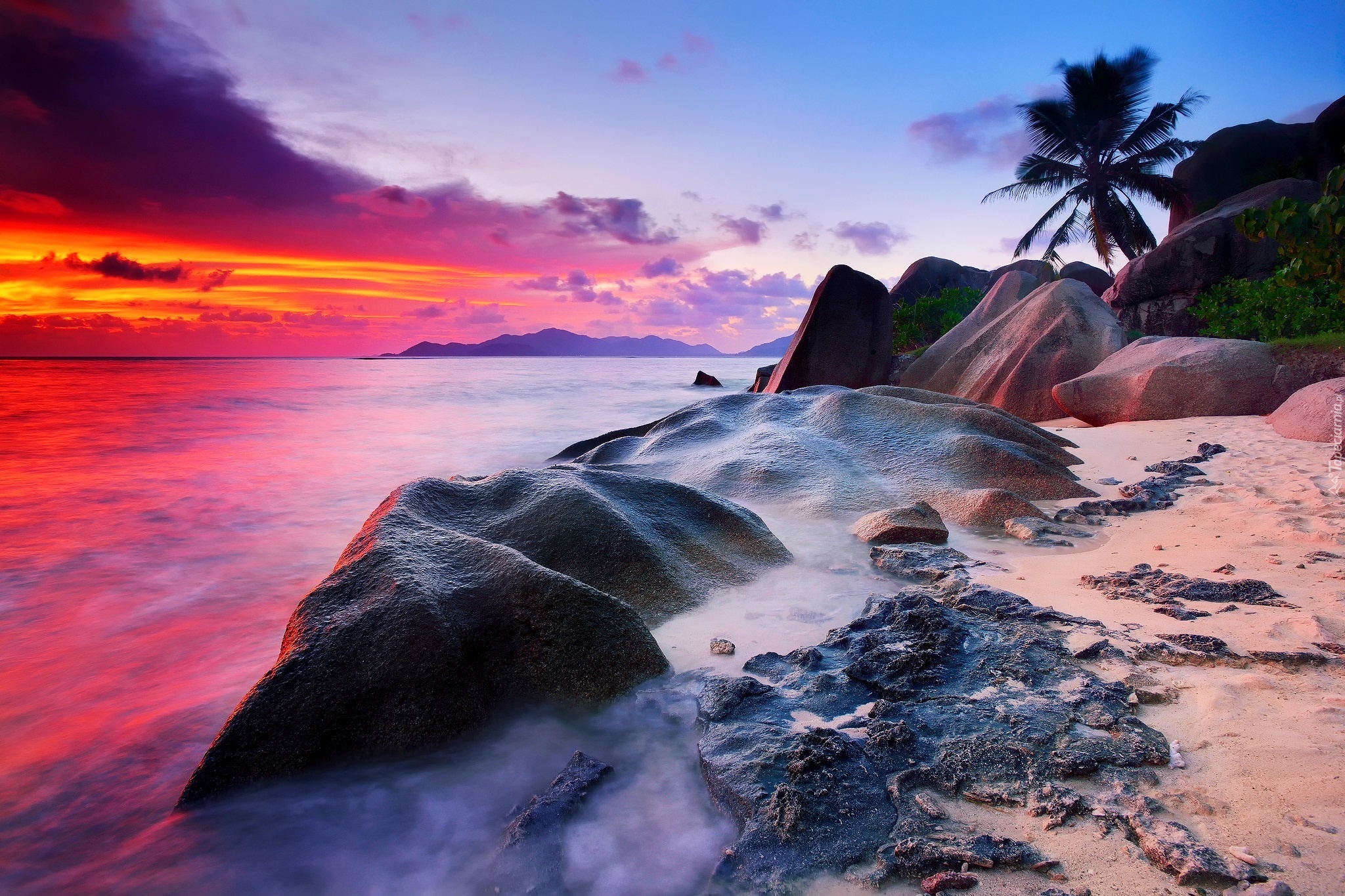 Edytor tapety: Ocean, Plaża, Głazy, Różowy, Zachód Słońca