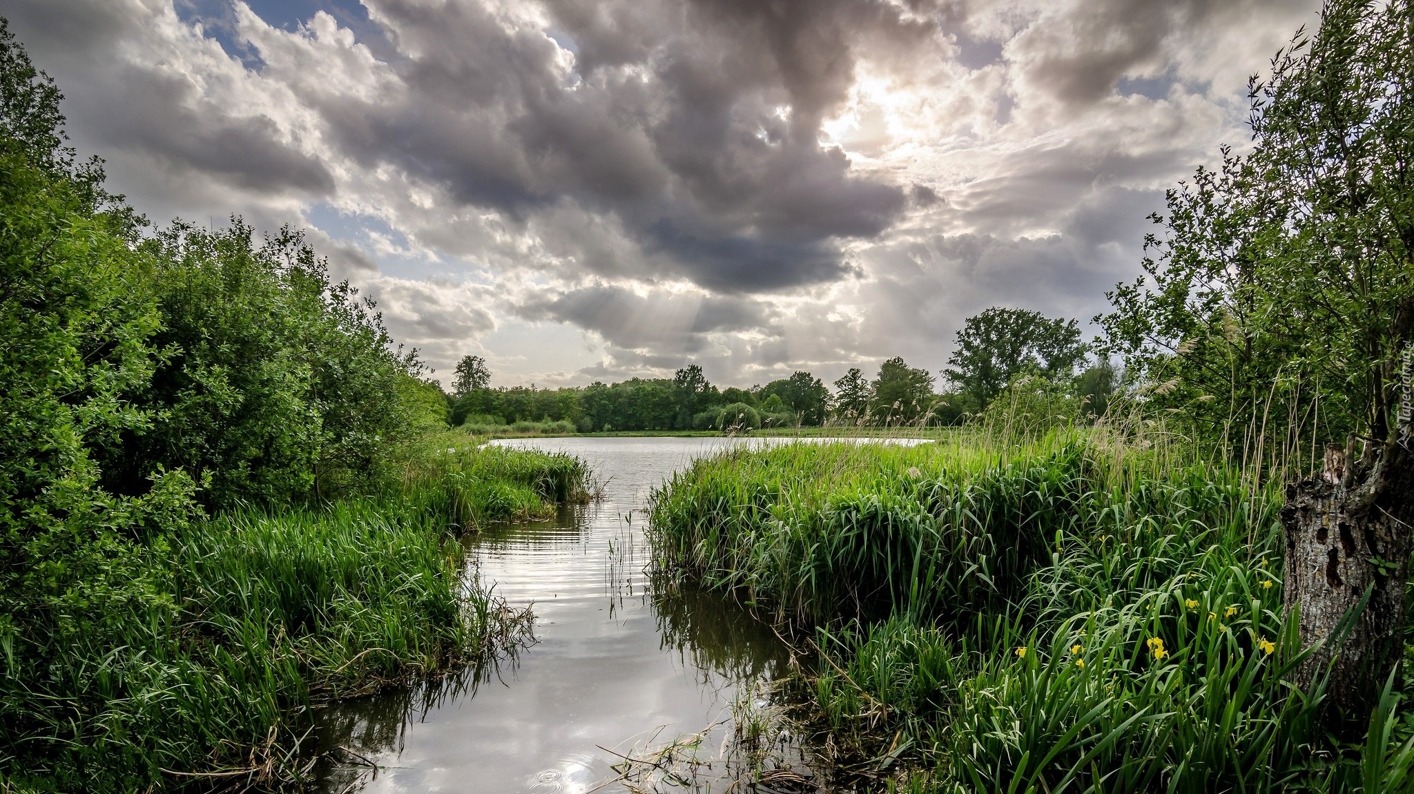 Edytor tapety: Zachmurzone, Niebo, Las, Rzeka, Szuwary