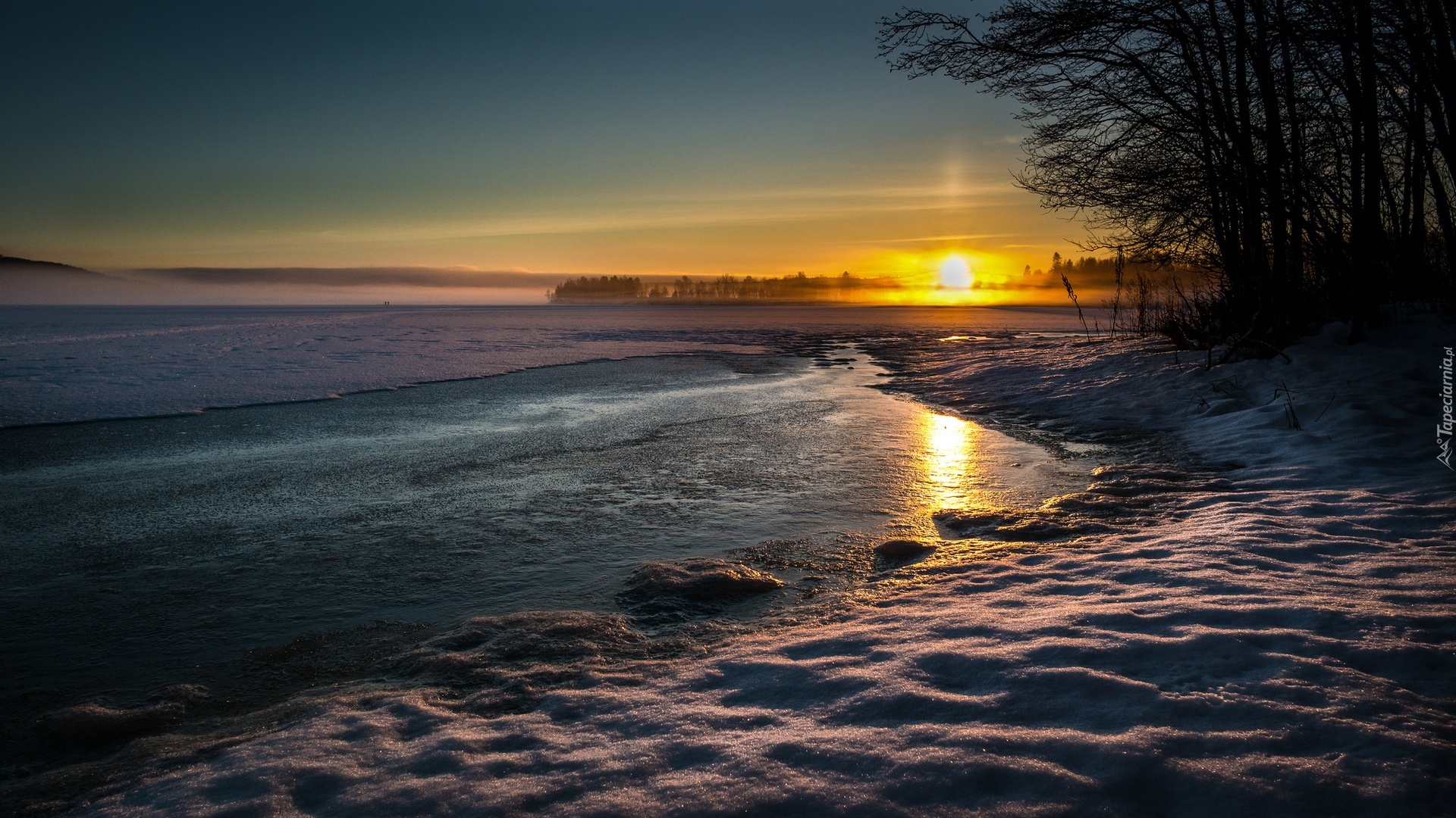 Edytor tapety: Drzewa, Jezioro, Promienie, Słońca, Zima