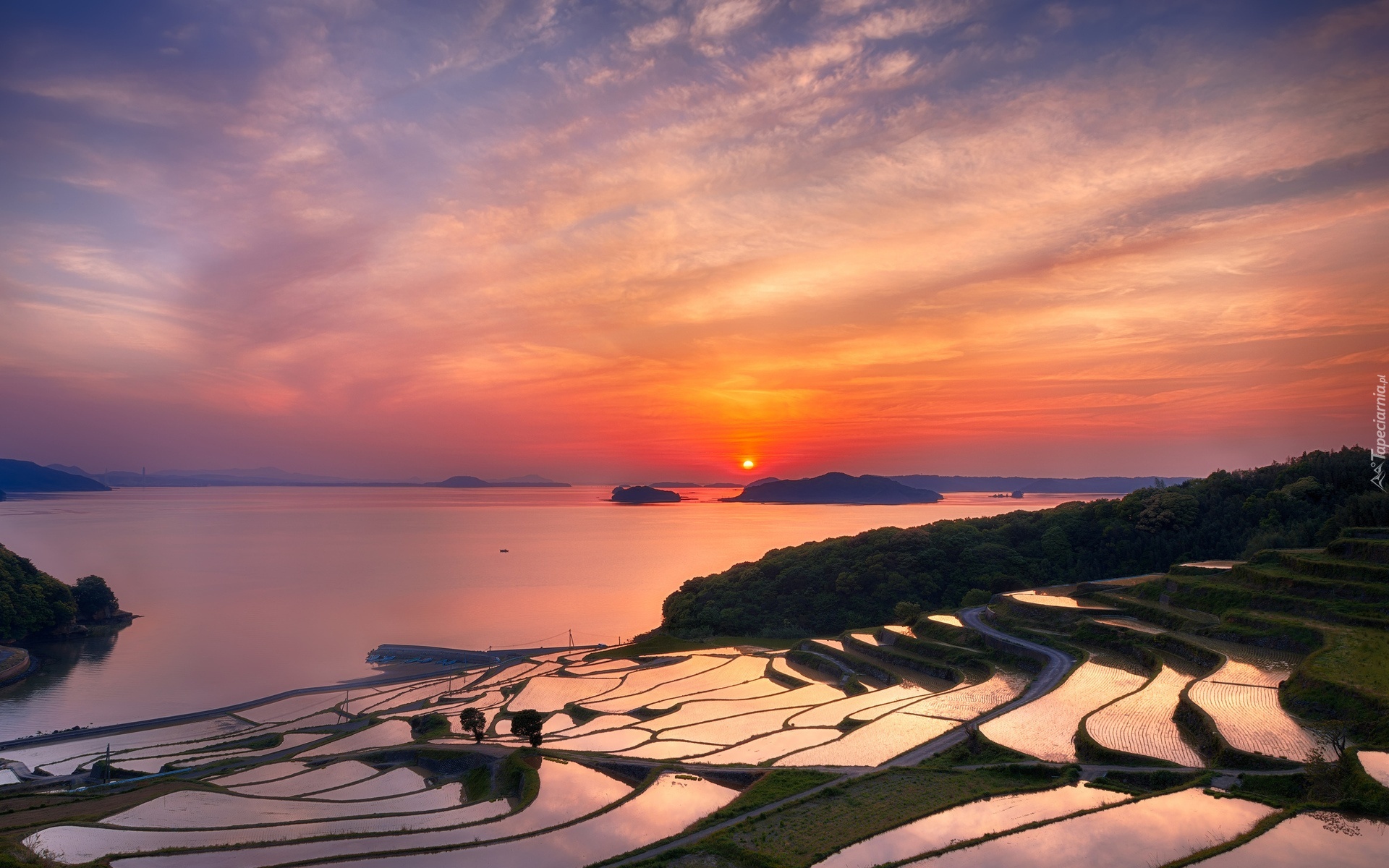 Edytor tapety: Jezioro, Wyspy, Tarasy, Pola, Ryż, Zachód, Słońca