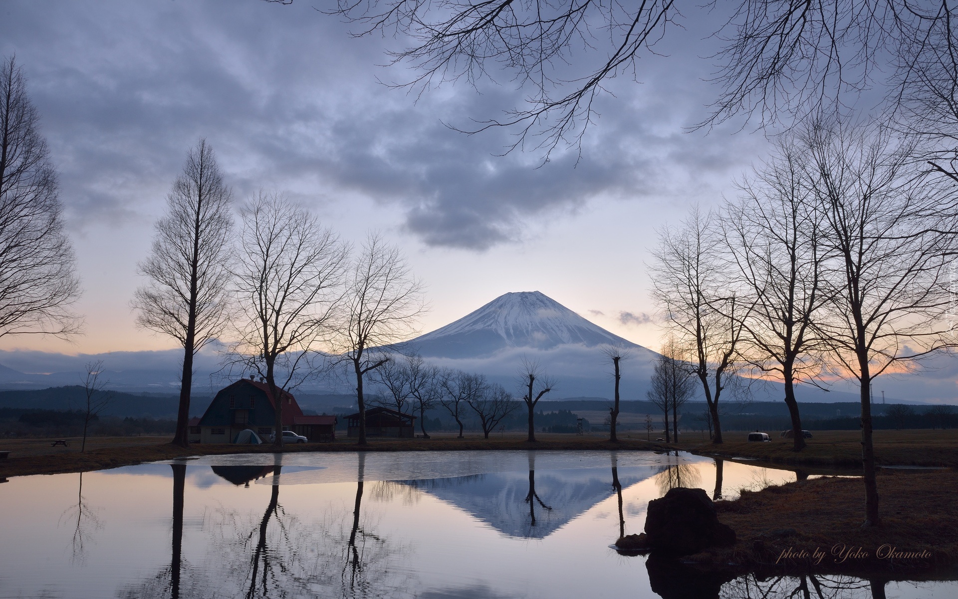 Edytor tapety: Staw, Domy, Drzewa, Chmury, Fudżi, Mgła, Japonia