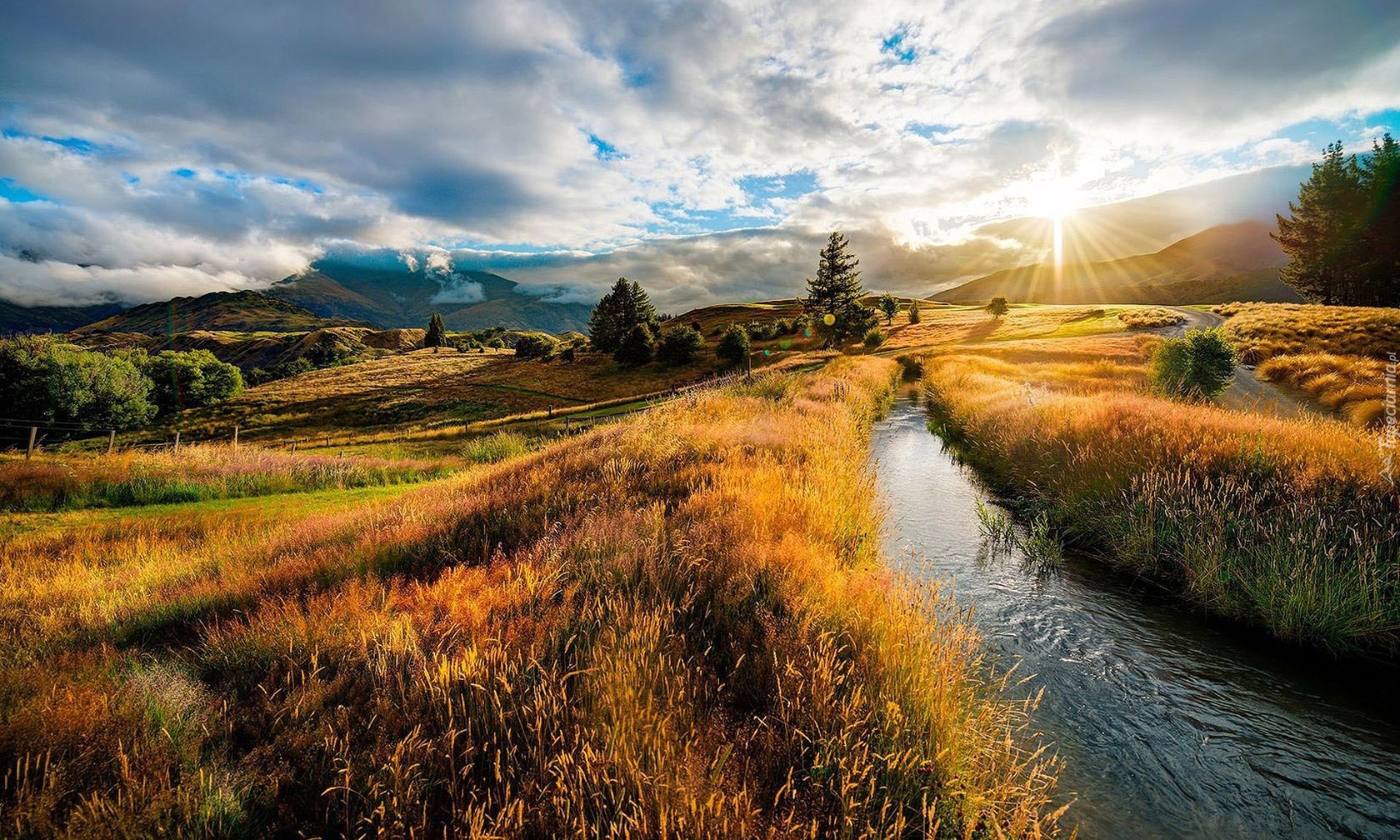 Edytor tapety: Promienie, Słońca, Góry, Pola, Rzeczka, Rzeka, Strumyk, Trawy