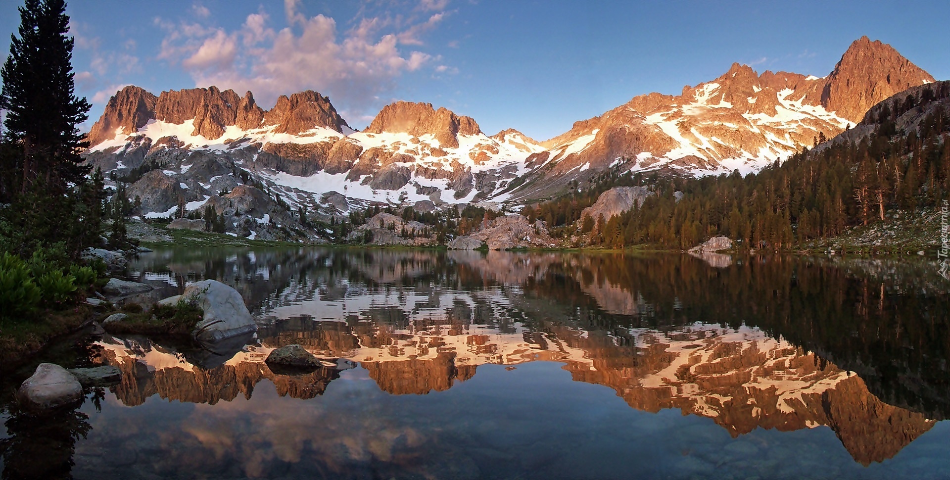 Edytor tapety: Góry, Lasy, Jezioro, Przebijające, Światło, Odbicie