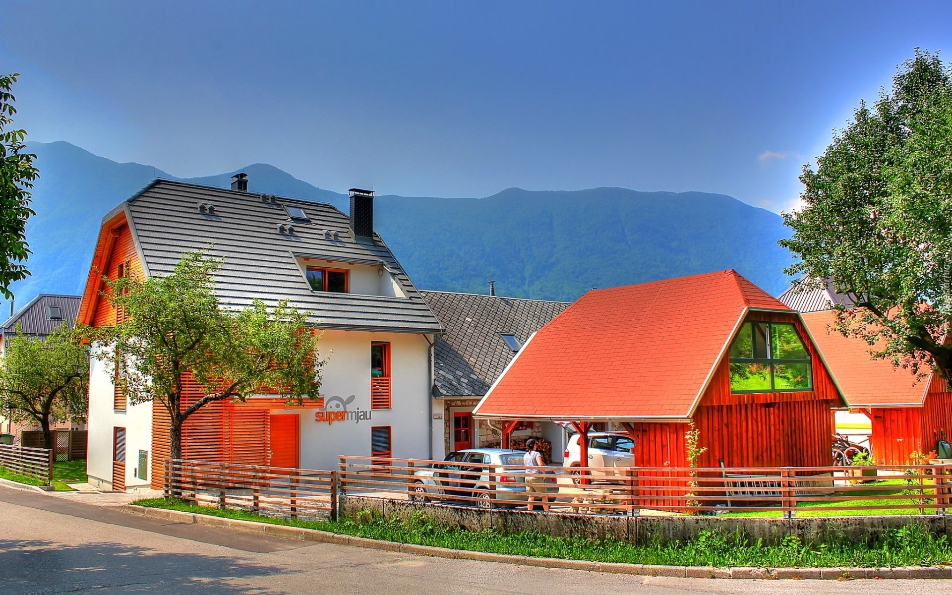 Edytor tapety: Domy, Droga, Góry, Lasy, Słowenia